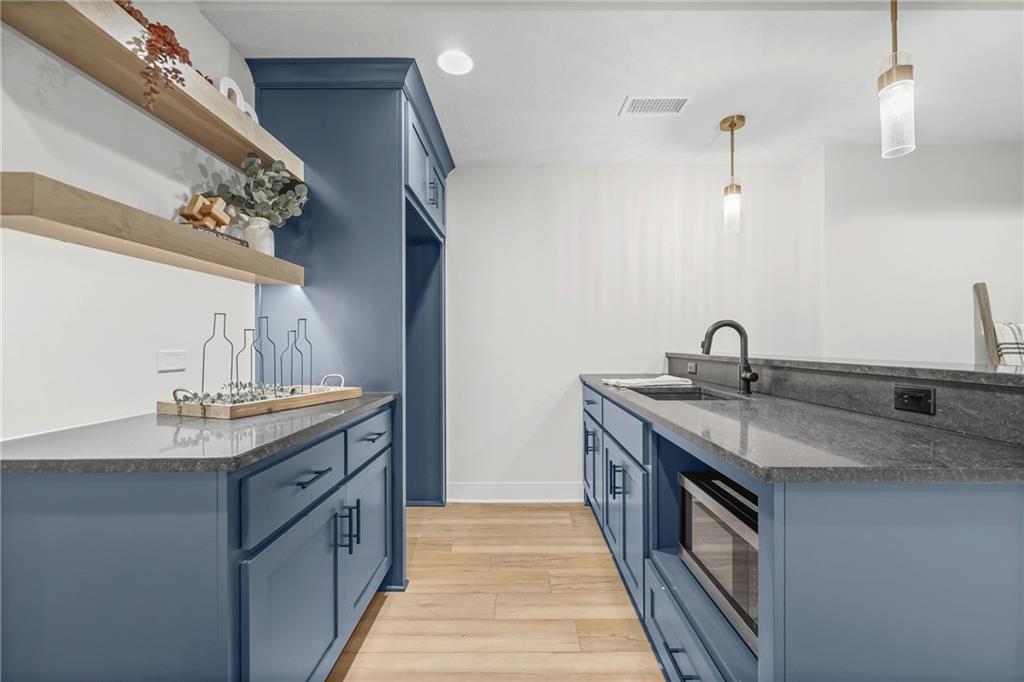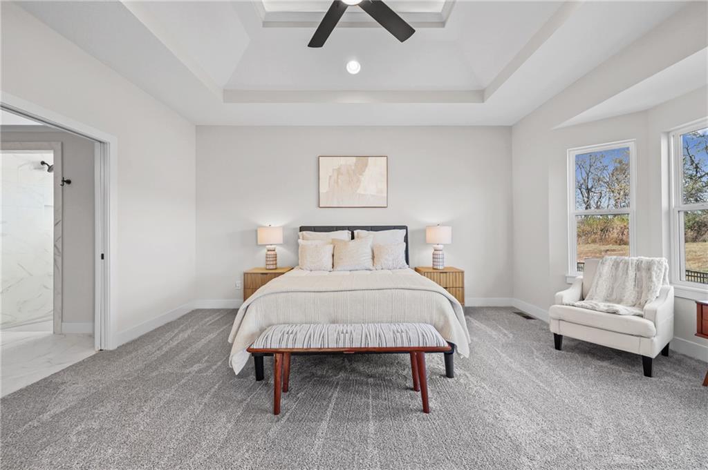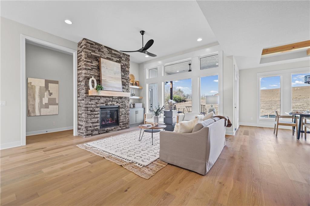 Move-in ready, beautifully designed & built for long-term livability! This exceptional home offers high-end craftsmanship, thoughtful accessibility features & beautiful designer finishes throughout. Located in the highly rated Lee’s Summit School District, it's just a short walk to the neighborhood elementary & only minutes from LSW High School! A rare find in today’s market, this home offers true ZERO ENTRY access, providing step-free transitions inside for enhanced ADA accessibility, long-term comfort & effortless first floor living. An ENERGY STAR 3.1 rating delivers superior insulation, energy efficient windows & HVAC system=improved indoor comfort & lower utility bills! Outside: beautiful board & batten siding w/stone accents, cedar trusses & covered front entry. Inside: classic-modern design makes a striking first impression w/soaring ceilings, rich engineered wood floors & an open, airy layout. The foyer features a stunning wood-accent barrel ceiling & custom wall trim that sets an elevated tone. An impressive floor-to-ceiling stone fireplace graces the family room & a wall of windows drench the main level in natural light, contributing to the seamless flow into the kitchen & dining area. The designer kitchen is a true showstopper, featuring an oversized quartz island & premium custom cabinets that perfectly complement the wood accent range hood. A gas cooktop & stainless appliances=chef's delight, w/a walk-in pantry providing super storage space for grocery staples. The primary suite is a true retreat, featuring a spacious bedroom w/tray ceiling & large windows plus a spa-like bath w/dual vanities & an oversized walk-in tile shower. A large secondary bedroom, full bathroom, a pocket office & spacious laundry room round out the main floor. Downstairs, you'll find a large WOW FACTOR Rec Room w/floor to ceiling fireplace, a gaming area, wet bar, 2 additional spacious bedrooms serviced by a 3rd full bathroom & a 1/2 bath (with urinal!) - perfect for poker night!