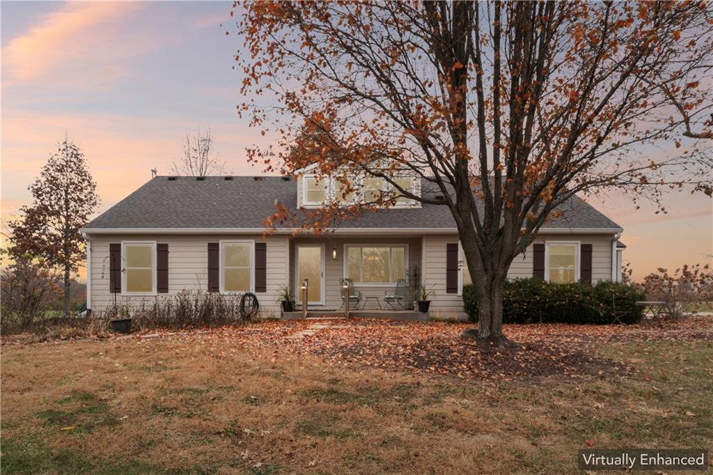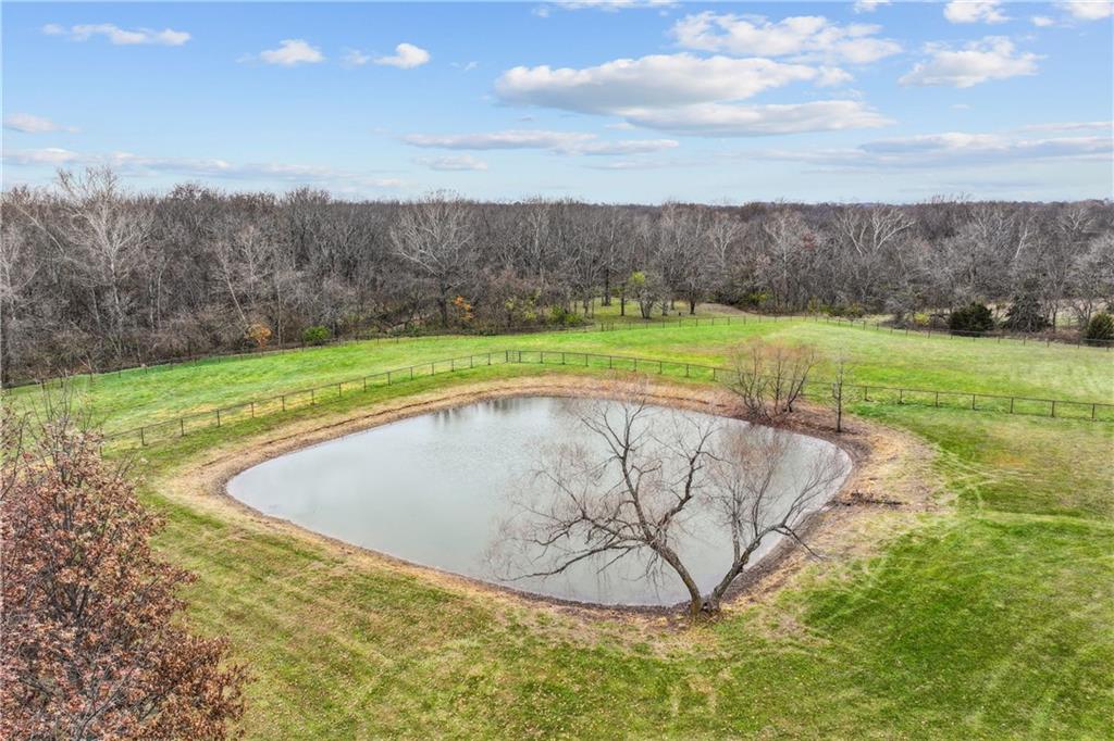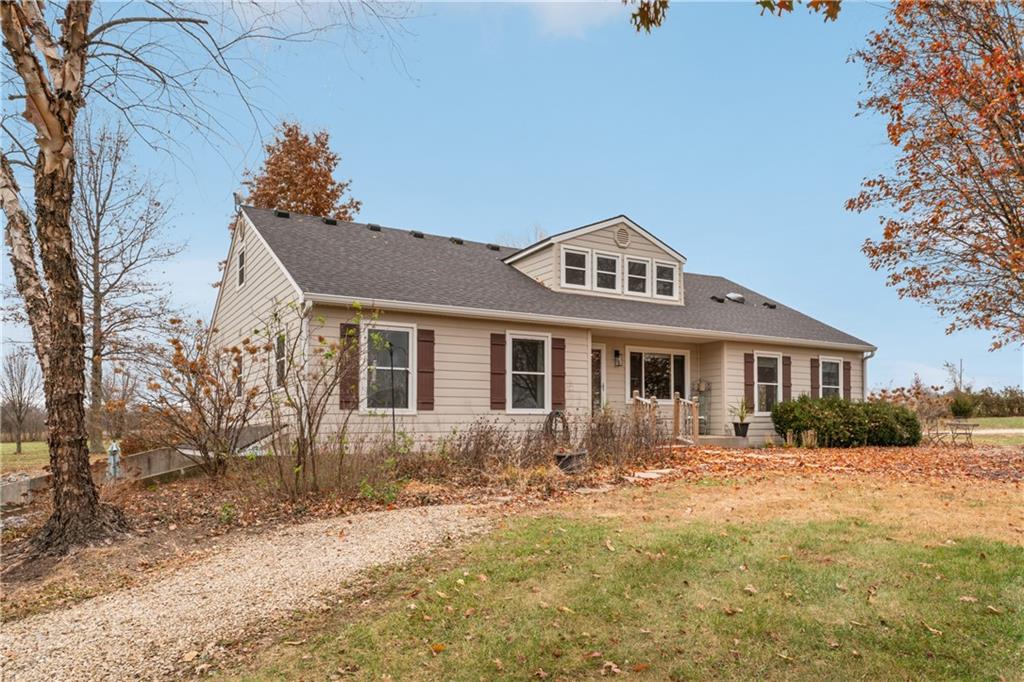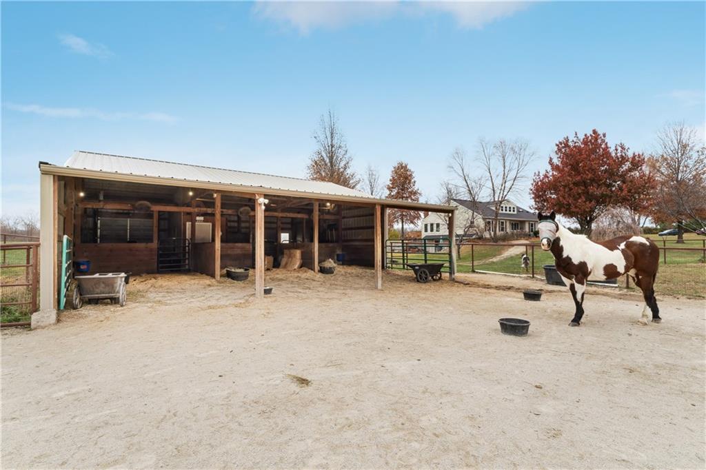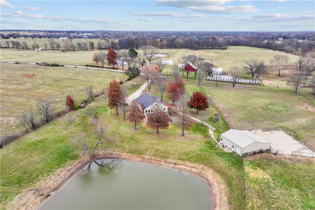 Just minutes from Overland Park and Louisburg, this 20-acre retreat offers unmatched privacy, incredible views, and a perfect blend of woods, pasture, and water. With ten acres of mature timber, ten acres of open pasture, a stocked, manicured pond, and Poney Creek running the full length of the property, it is the ideal blend of beauty and function. Horse ready and fully set up, the property includes horse safe fencing, cross fencing, a heated automatic waterer, three stalls with an attached run-in shed, a tack and storage room, plus water and electric in the barn. The home offers more than 3,100 square feet of comfortable, thoughtfully designed living space. Large windows and a brand-new deck capture sweeping views and daily wildlife. Inside, the great room is perfect for gatherings, and the kitchen is built for entertaining. Key updates give serious peace of mind. The home features 20 new thermal windows, a new sliding door, new gutters with guards, new composite siding with a 50-year transferable warranty, a one-year-old HVAC system, a one-year-old water heater, and a 5-year-old, 30-year roof. Follow the long private driveway to a property that feels secluded, peaceful, and truly special. This is a rare opportunity to live the outdoor lifestyle you want while staying close to the conveniences you need.