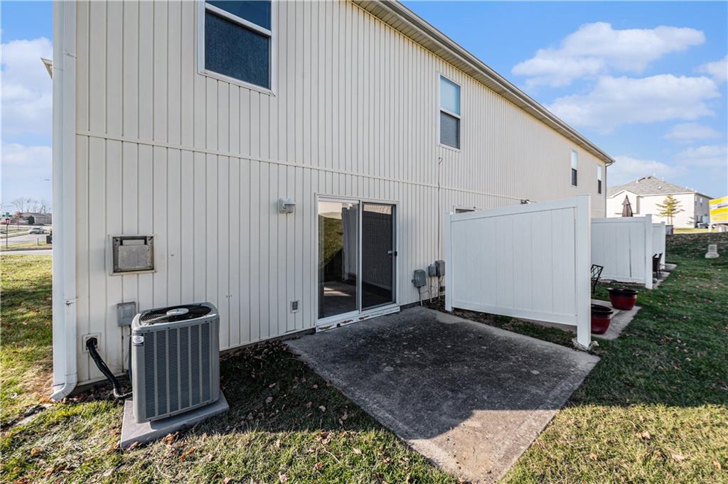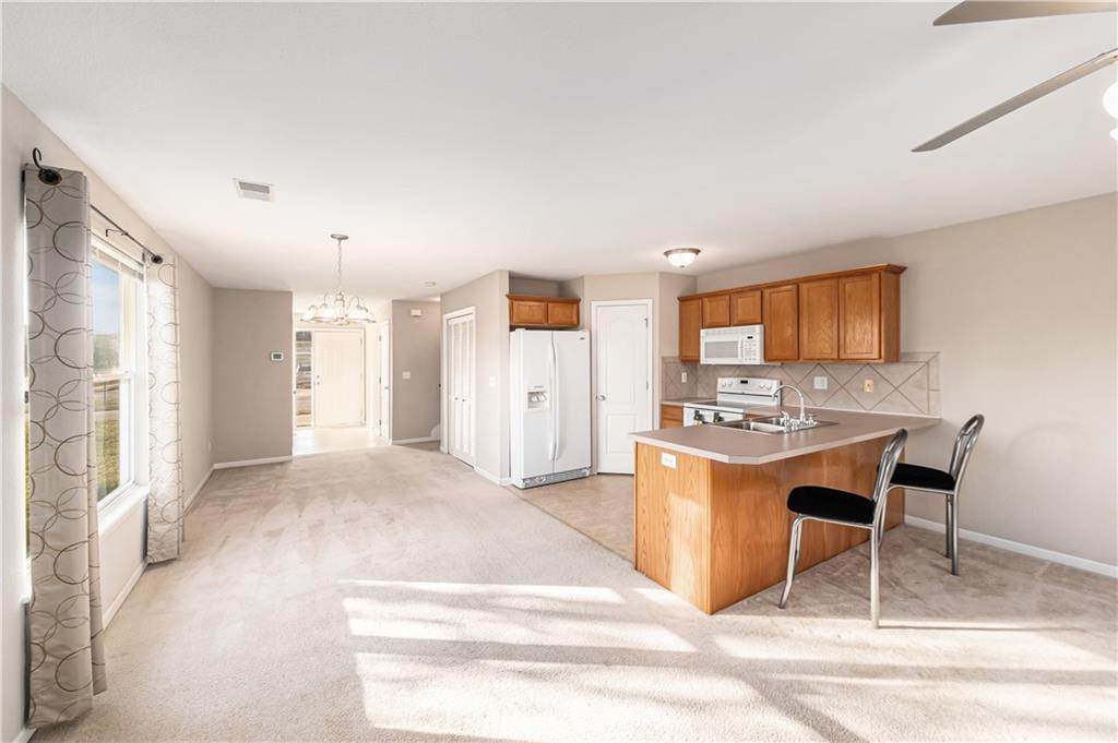 Location, location, and PRICE! Don't miss this fabulous, maintenance-provided 3-bedroom, 2.5-bath townhouse perfectly positioned on a desirable corner lot with a one-car garage. Step inside to a welcoming main floor featuring a convenient half bath and an open-concept kitchen, dining, and living room. The kitchen offers a walk-in pantry, bartop seating for four, and includes all appliances,dishwasher, stove, refrigerator, and microwave,that remain with the home at closing. The living room is light and inviting with neutral paint, a ceiling fan, gas fireplace, and a slider leading to the private patio, ideal for relaxing or entertaining. Upstairs, you'll find all three bedrooms. The spacious primary suite showcases a tray ceiling, new carpet, tray ceiling and ceiling fan. The ensuite bath offers both a jetted tub and a separate shower. Two additional bedrooms, a second full bathroom, and a dedicated laundry room (washer and dryer stay!) complete the upper level. Major updates add peace of mind, including a new roof, new hot water heater, and new A/C. Situated just off 152 Highway and North Oak, with quick access to 435, 169, and I-35, this home offers unbeatable convenience for commuting, shopping, dining, and more.