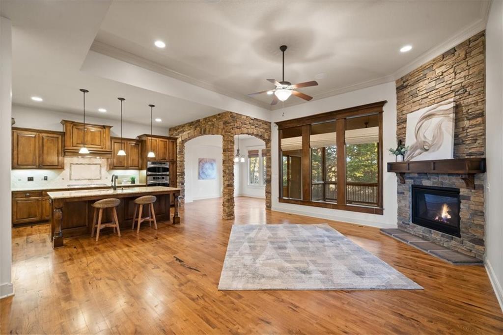 Main level living at its best in this Immaculate reverse 1.5-story home offering an exceptional floor plan and outstanding craftsmanship throughout. The open first floor is ideal for both everyday living and entertaining, featuring fresh new paint throughout most of the main floor, along with a stunning kitchen with a gas cooktop, oversized island, abundant cabinetry, and a massive walk-in pantry with dual access from both the kitchen and the garage entry. Rich hardwood floors, striking stone accents, and three fireplaces add warmth and character throughout the home. The primary suite is a true retreat, offering direct access to the screened-in deck, a beautiful en suite bath, and a massive walk-in closet conveniently connected to the laundry room. The finished lower level expands the living space with a generous recreation room featuring a fireplace and bar, two sizable bedrooms, a full bath, and expansive unfinished storage space that makes for a perfect shop, hobby room or leave as storage. The screened-in deck provides a peaceful, private escape surrounded by mature trees and enhanced by beautiful outdoor nightscape lighting. Conveniently located with easy access to the community pool, award winning schools, and Cedar Niles Park with miles of nature trails. Forest View subdivision features one of the most photographed waterfalls in the area, a huge zero entry pool, water park area, sand volleyball, sport courts, playground, and several grilling/picnic areas. Just in time for the holidays, this beautiful home has it all!