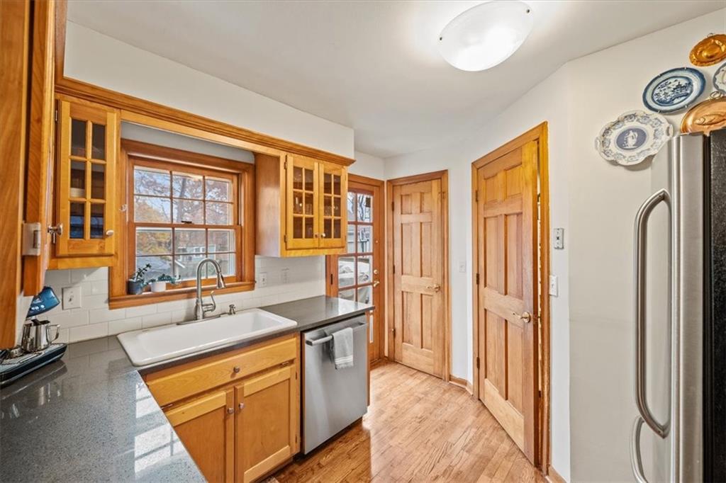 Charming inside and out, this Westwood 2-story home sits on a picturesque, tree-lined block and a large lot. Beautifully updated with original character & detail, including curved archways, hardwood floors, fireplace, and woodwork. Living room with a sitting area next to the fireplace, perfect for a cozy Winter day. Private den/office space off the main living area. The dining room features a new, built-in banquette and light fixture. Main-level half bath off the kitchen. All appliances stay with the home, including the washer/dryer. Large primary with a walk-in closet. Updated interior paint. Full, dry basement with lots of storage. Attached garage and storage shed in the backyard. Large deck overlooks the big backyard. Room to add onto this house and still have a big yard. Walk to coveted Westwood View Elementary, Fairway Shops, Woodside, St. Agnes, Miege, parks, and more. Minutes to the Plaza and the highway. SM East area.