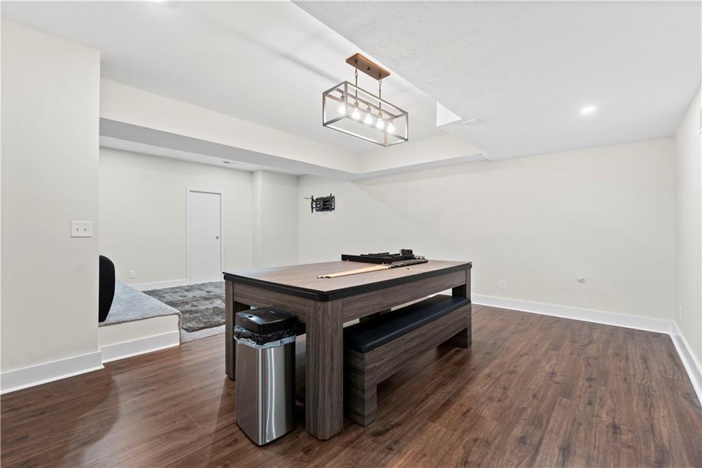 Stunning 6-bedroom, 5-bathroom home with ample space and luxurious features throughout. The main level offers a versatile guest bedroom or office, while the second floor boasts 4 additional bedrooms, including a spacious primary suite with a large bathroom and oversized closet. The finished basement is an entertainer's dream, featuring a theatre room, wet bar, home gym, and a bonus bedroom with a full bath. Outdoors, enjoy the screened-in patio, large concrete patio with built-in fire pit, perfect for gatherings. Centrally located with easy highway access and just a short walk or bike ride to nearby shopping. The Reserve at Woodside Ridge offers a convenient location to highway access, shopping centers, and the Rock Island Trail. The amenities complex features: a club house, pool, pickleball court, hammock garden, and playground area. The HOA dues also include trash, recycling, and paved walking trails.