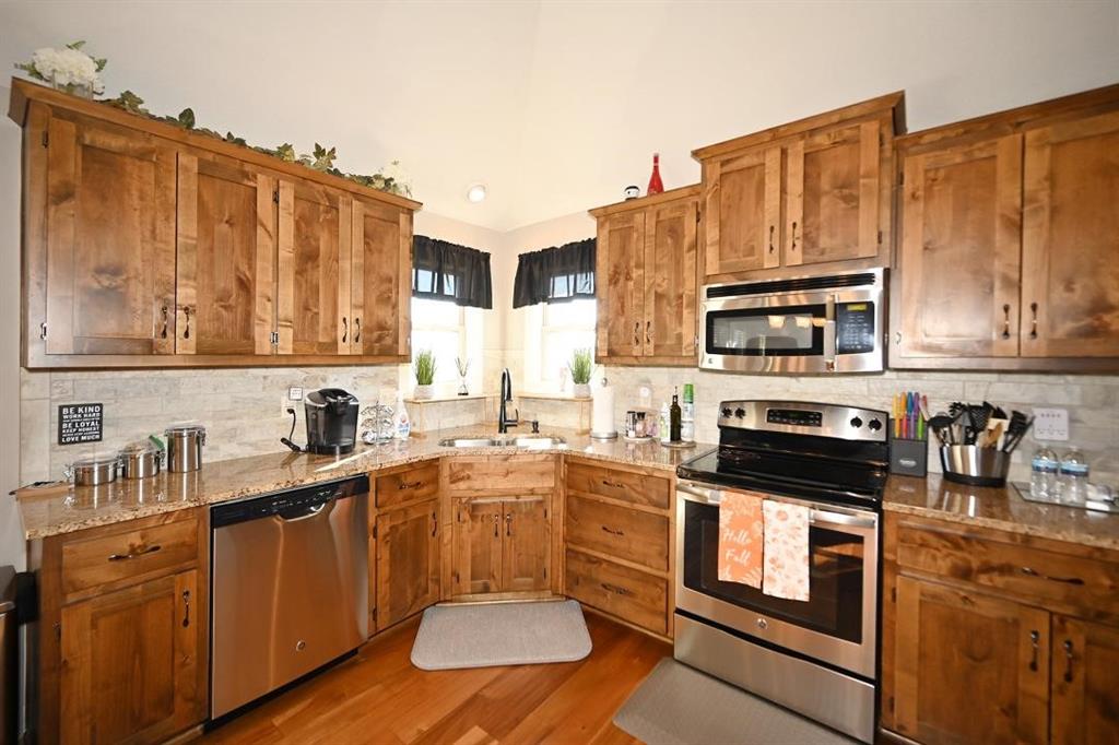 This home features an oversized three-car garage with a dedicated storage room. The lower level offers a beautiful, spacious family room, a full bathroom, and a large bedroom. On the main level, you’ll find gorgeous hardwood floors throughout, a stunning stone fireplace, an open dining area, and a kitchen with abundant cabinetry and granite countertops. The main-level laundry room adds convenience, and there is also a full guest bathroom. This level includes two additional bedrooms and a large master bedroom with carpet. The master bathroom features a dual vanity, a walk-in shower, and a walk-in closet and additional closet space. Outside, the property offers a large backyard and a covered deck perfect for relaxing or entertaining.