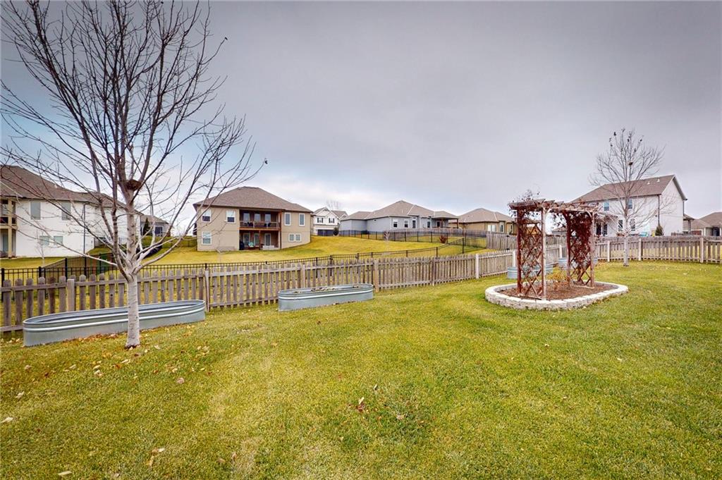 This beautiful Trumark Home - The Marie II is a Reverse 1.5-story / Ranch. This home is move-in ready and only 6 years young! Featuring 4 bedrooms, 3.5 baths, and a 3-car spacious garage, this property sits on nearly half an acre—one of the largest lots in the neighborhood—complete with a fenced backyard. Step inside to an open, high ceiling, inviting floor plan with a spacious living room that flows seamlessly into the dining area and kitchen. The kitchen offers granite countertops, ample cabinetry, a walk in pantry AND a butler’s pantry with a wine fridge for added convenience. The main-level Primary Suite includes a large walk-in closet with pulldowns connected to the laundry room, plus a gorgeous en-suite bath with quartz countertops. A second main-level bedroom adds versatility for guests or office space. The finished lower level expands your living space with a generous family room and wet bar, along with Bedroom #3 featuring a private full bath, and Bedroom #4 with an attached half bath. A storm shelter provides peace of mind. Outdoor living shines with an oversized stamped patio, built-in firepit, and a grill gazebo that stays. The back quarter of the yard is home to multiple garden areas with strawberries and blueberry bushes, and a 6-zone sprinkler system keeps everything lush and green.