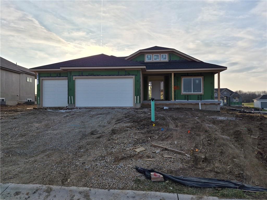 Lot 48. Hudson by Pfannes Homes. Home is estimated to be completed in February of 2026. This great home in a GOLF COURSE community with lawn maintenance/snow removal provided has all the upgrades! 3 car garage with the main 2 car section that is 24' deep and the 3rd car is 30' deep! This amazing garage also includes a mini-split to keep it comfortable. The open main living area includes a fireplace with cabinets, additional kitchen cabinets at the island, and a nice dining area. Oversized pantry! Plenty of light with windows all across the back. Huge corner lot with no neighbor directly behind! Primary suite includes large bedroom, bath and primary closet. The second bedroom is good sized with full bath and linen closet. Lower level includes family room with wet bar, full bath and two nice bedrooms. Quartz in kitchen and bathrooms, tile floors in laundry and baths and wood floors in entry, living, dining and kitchen. Don't miss this opportunity to live in the Communities of Falcon Lakes, just off K7 with an easy 30 minute ride to the airport, 10 minutes to the Legends Entertainment and Shopping District and 30 minutes to Lawrence. Acclaimed Basehor-Linwood schools! Provided lawn maintenance includes mowing/trimming/blowing, weed/feed, and landscape/tree trimming, sprinkler turn on/turn off. Snow removal over 2".
