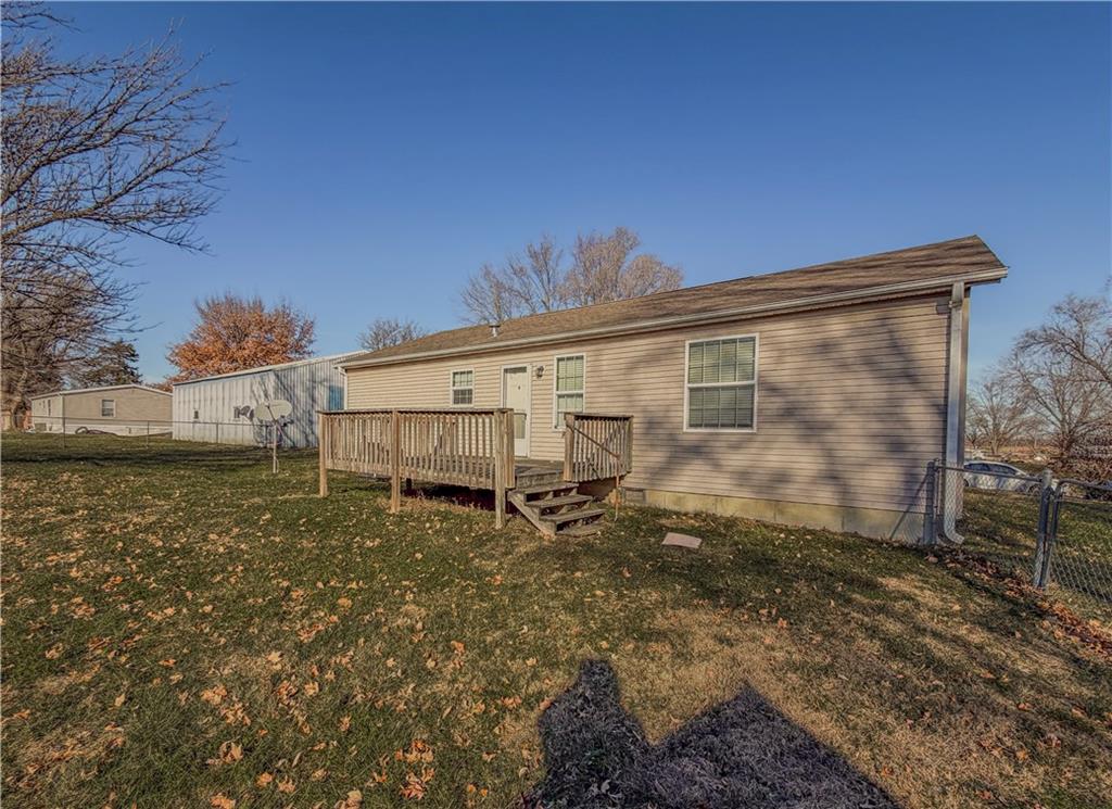 Don't miss this affordable manufactured home offering 3 bedrooms and 2 full bathrooms with nearly 1300 sq ft of comfortable living space with an open floor plan. Designed for low-maintenance living with all-electric utilities and durable vinyl siding. You'll pull up to a nice covered front porch and Enjoy entertaining on the large back deck, plus an additional deck off the side utility room for added convenience. Situated on an expansive yard spanning four city lots, this property provides plenty of outdoor space, including a fenced backyard (tons of room for yard games or the fur babies) including an 8x10 garden shed/she-shed. The standout feature is the 30x50 insulated shop with concrete floors, a 220-amp outlet, and plumbed for an air hose—perfect for hobbies, projects, or storage. Ideally located just 2 miles north of I-70, making commuting a breeze. This property is perfect for a small family, first-time home buyers, or anyone seeking space, functionality, and value. Being sold As Is.