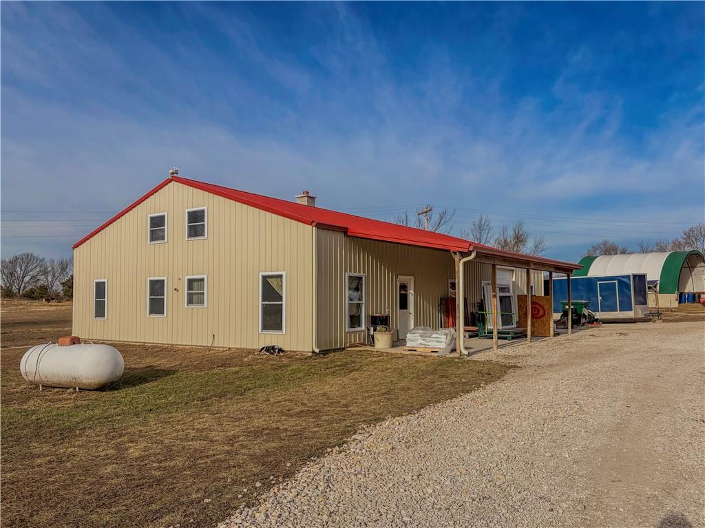 Nearly 19 acres surround this One-of-a-Kind rural property offering space, privacy, and endless possibilities. A Newly Amish built home (2024) features over 1,800 sq ft with 4 bedrooms and 2 full bathrooms, designed for comfortable living. Enjoy greeting guests on the 12x16 covered front porch, a large kitchen with granite countertops and pantry, and a coveted back deck off the living room—perfect for relaxing or entertaining not to mention enjoying the beautiful sunrises & sunsets! Built for low maintenance, the home offers vinyl siding and a metal roof, thermal windows plus a huge attached garage with a storm shelter for peace of mind. The property truly shines with its impressive outbuildings, including a 3-year-old 36x64 shop featuring a full shower bath, office area, two storage rooms, loft storage, and propane lines run throughout. With a 12x24 covered porch, this space offers excellent potential for a workshop, business use, or possible conversion to living space. Additional improvements include a Newly built 30x56 barn with 20’ lean-to and a 24x30 Quonset barn, providing ample storage for equipment, livestock, or hobbies. Multiple garden areas, along with established strawberry and blackberry patches, add to the property’s self-sustaining appeal. This rare acreage combines new construction, extensive improvements, lower Johnson county taxes, black top road frontage and rural tranquility—a must-see opportunity. Call today for your personal showing and further details as property is Amish owned. **Seller also willing to subdivide into a smaller acreage parcel.