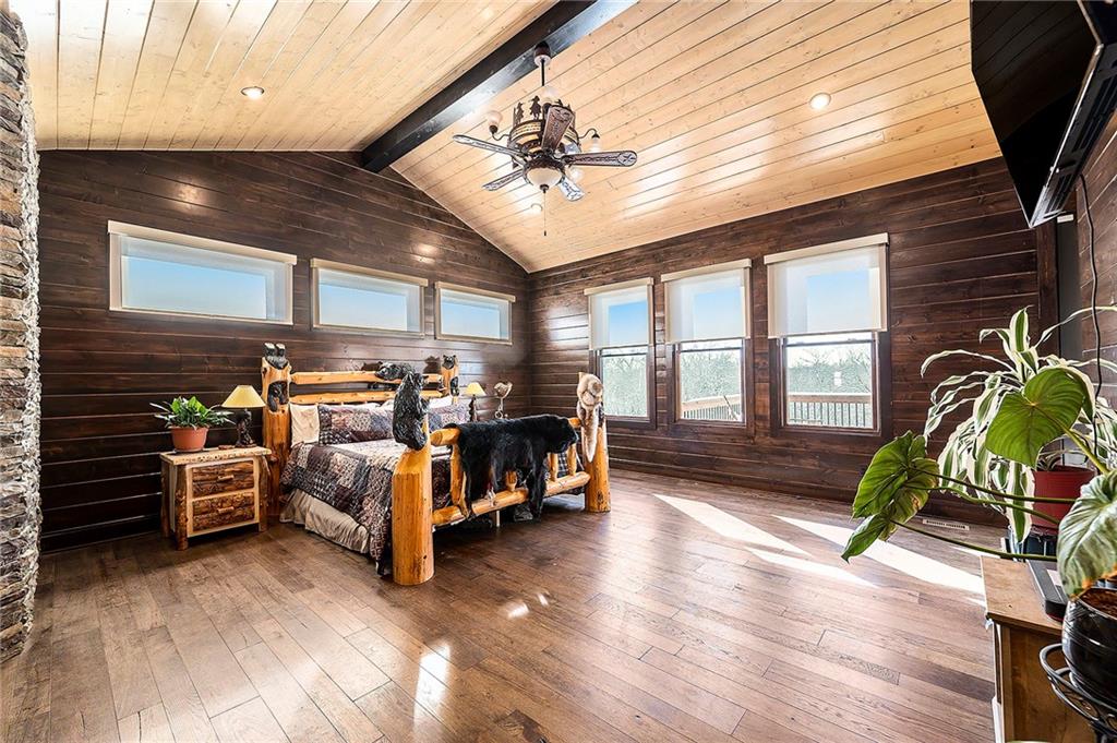Exceptional custom-built, lodge-inspired home situated on approximately 60± scenic acres, offering privacy, panoramic views, and quality craftsmanship throughout. The home features a striking great room with vaulted ceilings, exposed timber beams, tongue-and-groove pine walls and ceilings, and a floor-to-ceiling stone fireplace with custom built-ins. The kitchen is thoughtfully designed with high-end stainless steel appliances, custom cabinetry, and generous workspace. The primary suite offers a private retreat with a spa-like bath featuring a copper claw-foot soaking tub. Warm wood tones, stone accents, and expansive windows create a seamless connection to the surrounding landscape. Outdoor living includes a covered deck and patio overlooking rolling terrain and timber. The property includes two outbuildings and a mix of open ground and wooded acreage, ideal for hunting, recreation, and nature enjoyment.