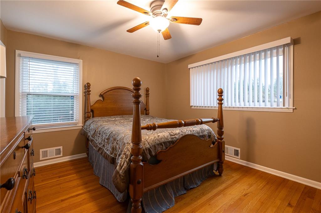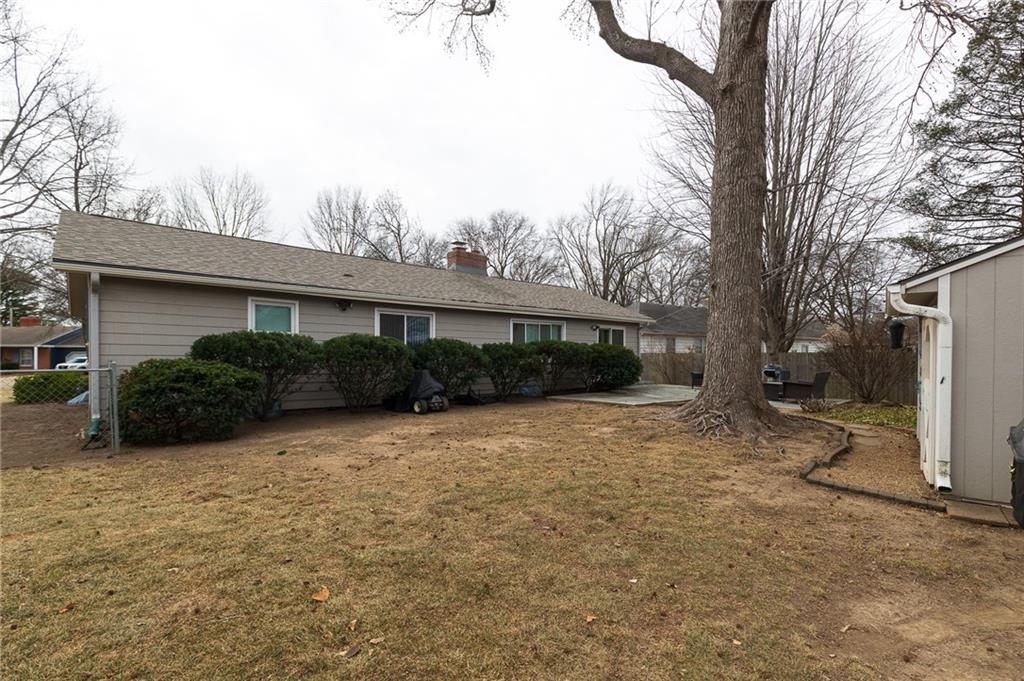 Ideally located, this charming ranch offers convenient one-level living just minutes from Avila College, Town Center, fantastic restaurants, highways and shopping. The updated kitchen features white cabinetry, a built-in oven, drop-in range, granite countertops, and beautiful wood flooring that flows seamlessly throughout the home. Two spacious living rooms- each highlighted by a classic brick fireplace- create warm and inviting gathering spaces. The home also offers a formal dining room plus a cozy breakfast room off the kitchen. Three spacious bedrooms feature wood flooring, ceiling fans and two-inch blinds that allow abundant natural light. Two tiled bathrooms with built-ins- one with a shower/tub combination and a private primary bath with a walk-in shower. Situated on a large corner lot, the outdoor space boasts a generous patio, a quaint storage shed, and mature trees providing privacy. The full basement offers a blank slate, ready to be finished to suit your needs. This one won't last long!