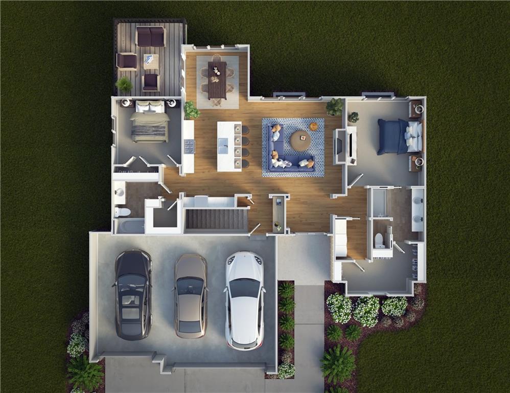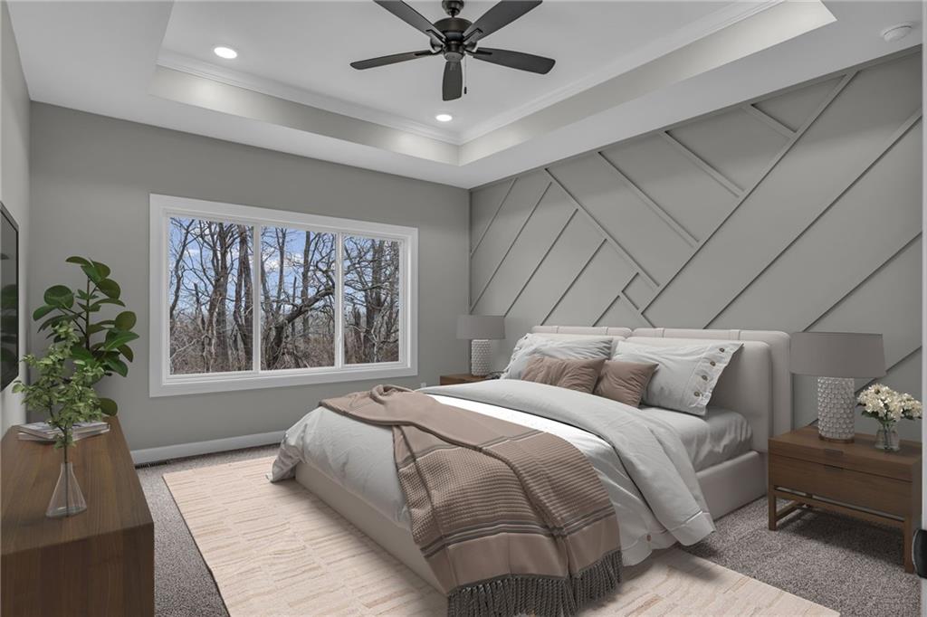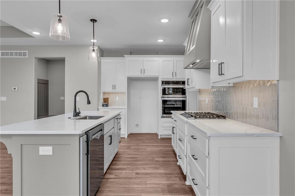 The Bridgeport II floorplan built by Drippé Homes. Open concept daylight basement with tons of natural light! Rustic ceiling beams, stucco front, and gorgeous built ins. Kitchen furnished with stainless appliances, gas cooktop, hood vent, microwave, wall oven, quartz countertops, large island with oversized sink and spacious butlers pantry. Two bedrooms on main with primary opposite other bedroom. Ensuite features double vanity, tiled walk-in shower, private water closet and gigantic closet with pass through to laundry. Mudroom off garage with boot bench. Finished basement with two additional bedrooms and rec room complete with wet bar, ready for hosting the next big game. Cozy up to the fireplace in the living room or enjoy the sunrise from the covered composite deck. Home backs to tree-line providing ultimate privacy with sod and sprinkler system included. Unfinished basement storage, built-ins and three car garage provide plenty of storage. Almost ready for your personal touch - schedule a showing today!