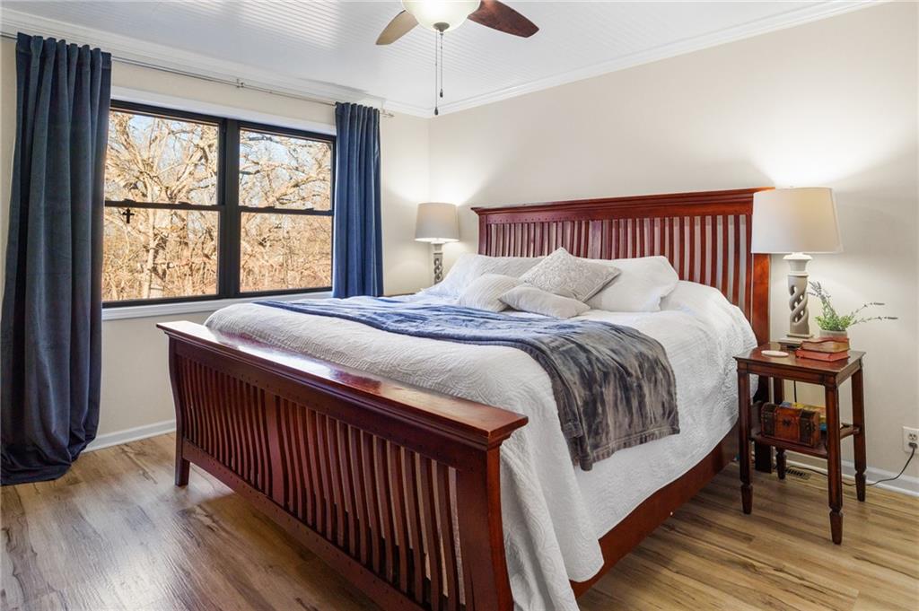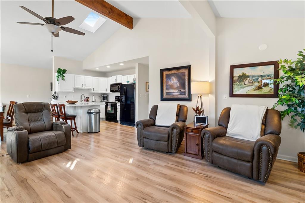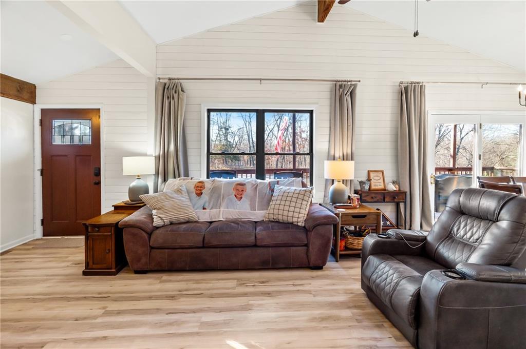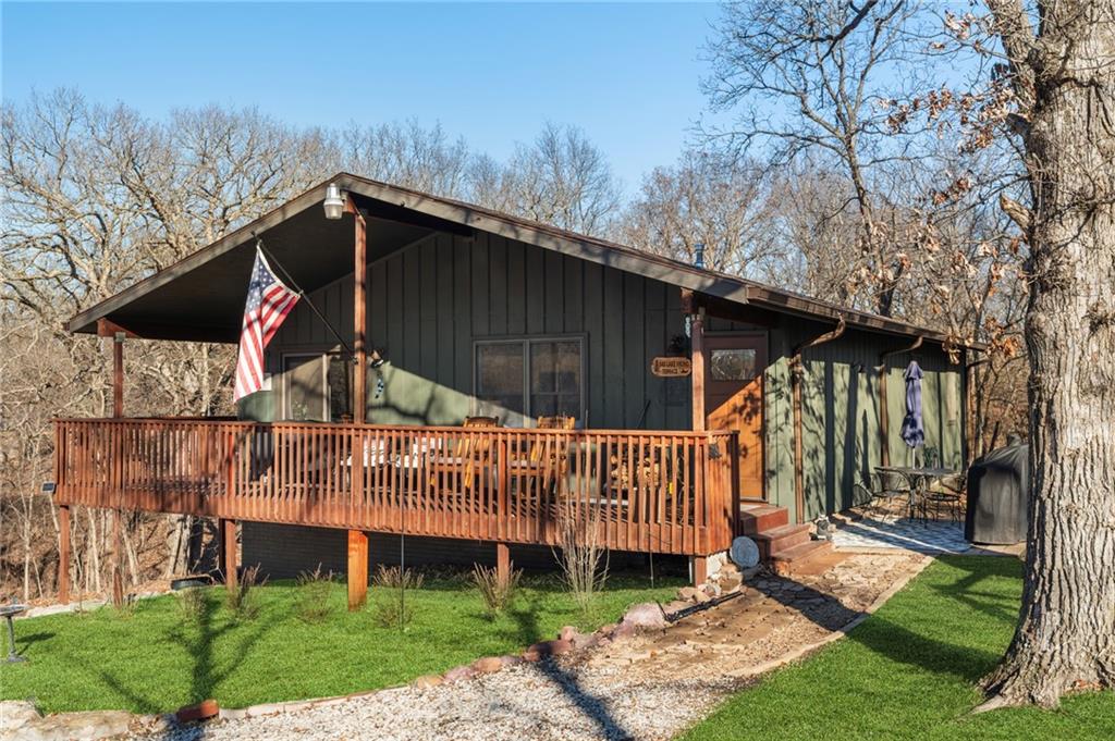 Lake Viking rare find with a boat slip at the Yacht Club. This property is situated on 1.3 acres near the South Entrance and offers a private, wooded setting with abundant wildlife and a treehouse-like feel. The home features 3 bedrooms and 3 bathrooms with numerous recent updates, including a new roof, new flooring, shiplap accent walls and ceilings, and fresh paint throughout. The open-concept kitchen includes freshly painted cabinets, quartz countertops, and comes fully equipped with appliances, including the washer and dryer. The primary bedroom offers a shower and a large window with peaceful views of the wooded lot. For those seeking a quiet retreat, the large covered and screened-in porch provides an ideal space to relax and enjoy the natural surroundings. The unfinished basement includes a pellet stove and offers excellent potential for a workshop or future finished living space. Additional features include a one-car garage. The sellers are open to offers on furnishings, and the boat is available for purchase separately.