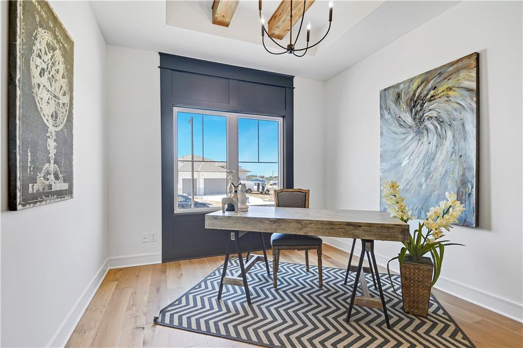 Experience refined luxury in the stunning Bayberry by JFE Construction. From the moment you enter through the impressive 8’ double front doors, you are welcomed by soaring ceilings, dramatic wood beams, and walls of windows that flood the great room with natural light. Expansive sliding doors open to a covered deck with a stone fireplace, perfectly positioned to capture serene greenspace views—an ideal setting for both relaxation and entertaining. The designer kitchen is thoughtfully curated with a large quartz island, stainless steel appliances, rich wood flooring, and an oversized walk-in butler’s pantry, offering both beauty and functionality. The primary suite is a private retreat, featuring a freestanding soaking tub, double vanity, zero-entry shower, and a spacious walk-in closet. A second main-level bedroom or office provides flexible living options. The finished lower level extends the living space with a family room, bar area, game space, two additional bedrooms, and a full bath—perfect for hosting guests. Throughout the home, you’ll find exquisite trim details, wood accent walls, striking black accents, and architectural elements that elevate every space. Located in Canyon Creek Forest, a luxury maintenance-provided, free-standing villa community. Lawn care and snow removal are included, allowing for a truly carefree lifestyle while enjoying all the amenities Lenexa has to offer. Estimated completion April 2026. Still time to make select design choices to personalize this exceptional home. Photos are of a former model and may include upgrades not included in the price.
