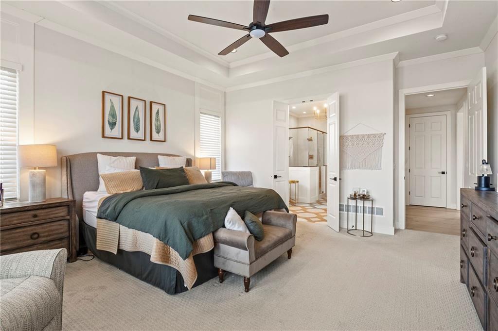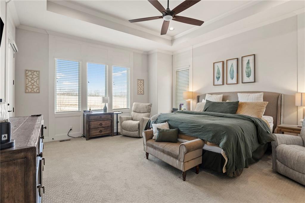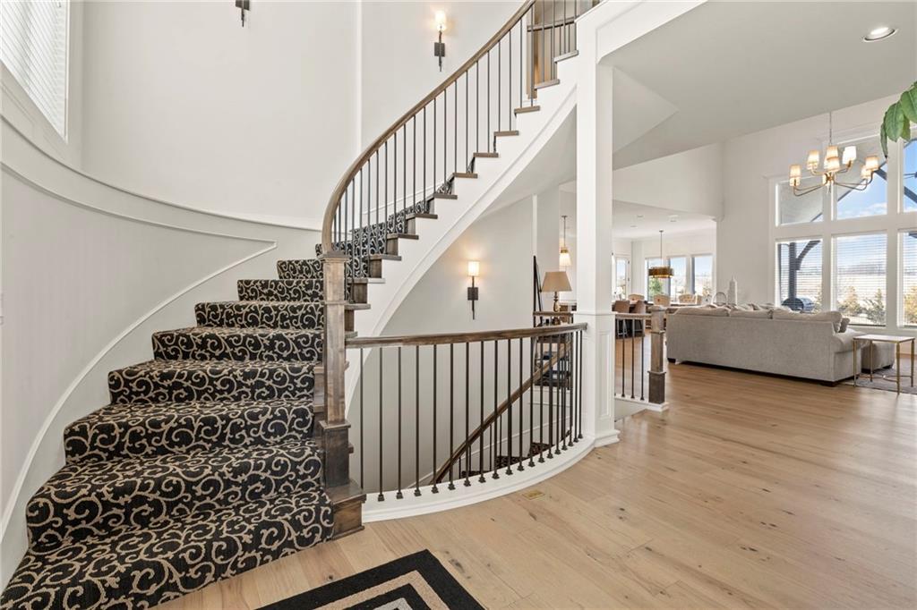 Better than new 1.5 Story Hamilton by BICKIMER HOMES located in a cul-de-sac backing to GREENSPACE! Full of upgrades including the iconic circular staircase, a GRAND TWO STORY GREAT ROOM full of windows, large covered patio that walks out to a spacious level yard backing to green space and trees, elegant curved stairs, MAIN FLOOR PRIMARY SUITE w/ large DOUBLE WALK-IN CLOSETS, unique main level FLEX ROOM/OFFICE just off the kitchen, spacious kitchen with large prep pantry. Three bedrooms upstairs, each with private ensuite baths plus an OVERSIZED BONUS LOFT UPSTAIRS! FINISHED BASEMENT with large recreational room, wet bar and bedroom. TWO LAUNDRY ROOMS (main floor laundry and second floor laundry) to accommodate busy family lifestyle! Future MEDIA ROOM stubbed out or use as addtl storage. Century Farms is a new upscale community located on a rolling hillside in Overland Park. Resort style swimming pool with slide, stunning club house with fitness room, kids play area, community vegetable garden, and pickle ball courts! Blue Valley Schools in Overland Park just off Quivira at 167th Street.
