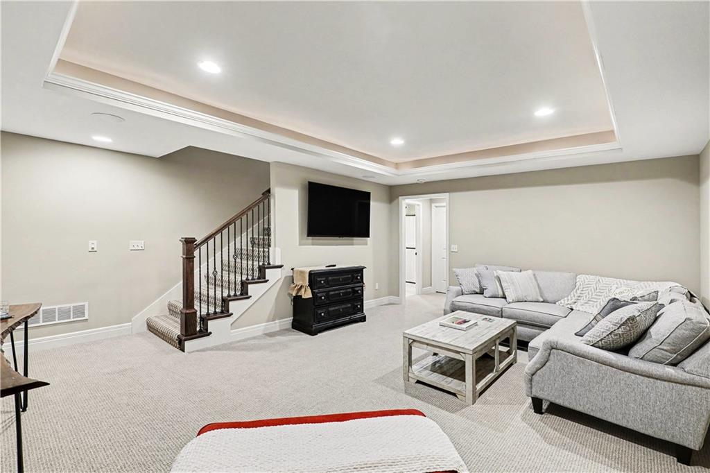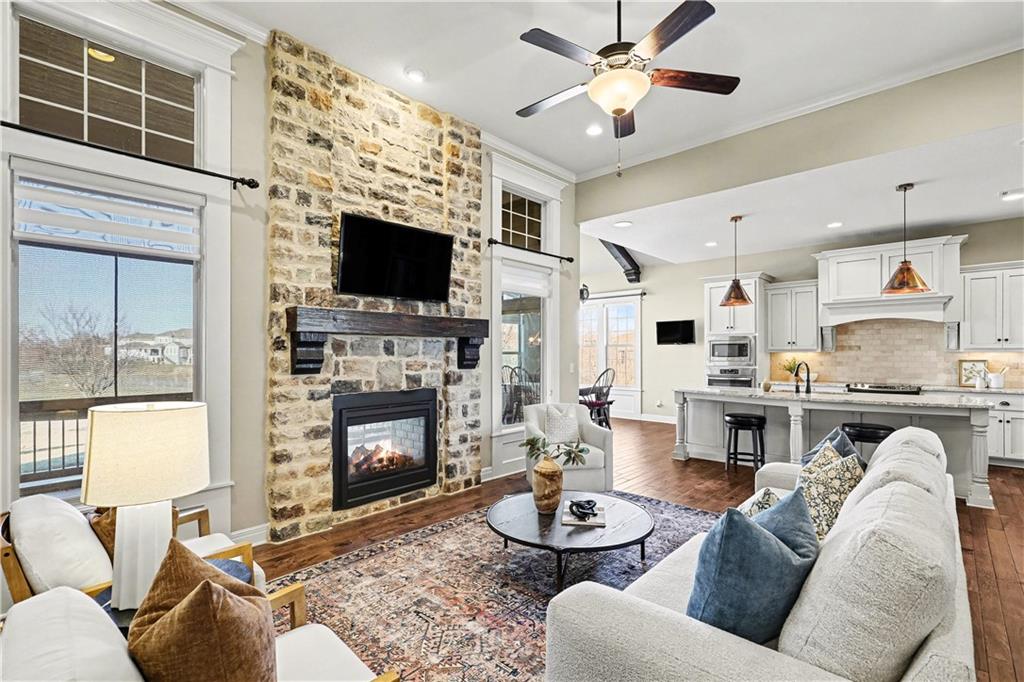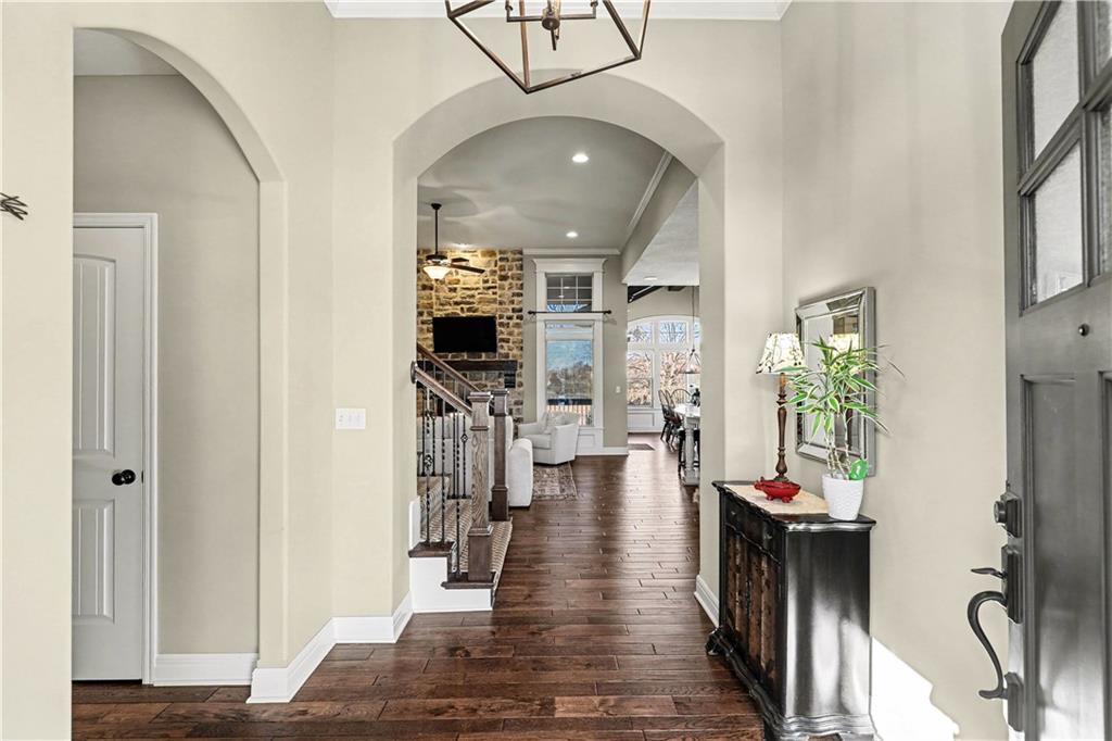 Welcome to 9158 W 178th Terrace, a beautifully maintained Emery Expanded 1.5-story home by James Engle Custom Homes, located on a quiet lot with pond views in the desirable Arbor View subdivision. This elegant home offers 6 bedrooms, 4.5 baths, and a 3-car garage, with an open, light-filled layout and upscale finishes throughout. The gourmet kitchen features granite countertops, a large island, stainless steel appliances, and a walk-in pantry. The main level includes a private primary suite with a spa-like bath and direct access to the laundry room, plus a flexible bedroom or office. Enjoy outdoor living on the covered patio with a fireplace overlooking the beautifully landscaped yard. Upstairs offers spacious bedrooms and a loft, while the finished lower level includes a recreation area, a sixth bedroom with egress, a full bath, and ample storage. Premium upgrades, including trim work, whole-home audio, and landscaping, make this move-in-ready home a must-see in prime Overland Park!