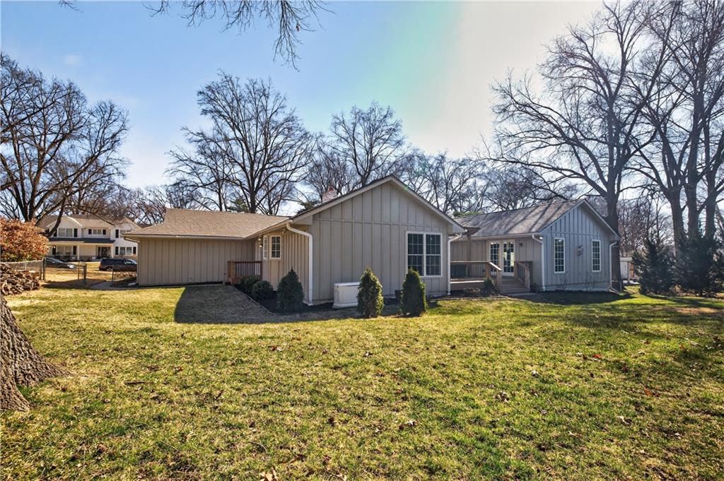 Charming and stylish, a Leawood ranch strait out of a magazine. Remodeled and expanded in 2016, this iconic ranch style home features over 3,100 sqft on the main level alone. Nestled in the heart of Leawood, walking distance to both Ranchmart Shopping and Grocery and nearby schools and parks. Thoughtfully updated with a kitchen/dining room addition, with granite countertops, stainless steel appliances, multiple eat-in areas, as well as a built-in day-bed, and enough space to host the largest of family gatherings. Also added nearly 10 years ago was the primary suite with a large private five piece bath, two walk-in closets, an electric fireplace, and access to the private deck. This home is full of classic charm; vaulted ceilings, pass-thru fireplace, built-in’s galore, bay windows, along with both a family room and living room just off of the dining/kitchen area. Washer and Dryer are located on the main level just outside of the primary bedroom. A second laundry room is available near the garage if needed, plumbing is currently servicing the wash sink. A second primary bedroom with a full bath and his/hers closets, two large guest bedrooms and a third bath, remodeled in 2020, can all be found on the main level. Also located on the main level is a built-in office just off of the entry. Great for these Midwest storms and winter ice squalls, this house is equipped with a whole house generator installed in 2021. House exterior painted in 2015, driveway replaced in 2016, new garage doors installed in 2017, garage floor mud-jacked and epoxied in 2023, newer deck and pergola to make your backyard both private and relaxing. Downstairs there is even more space, with 400 sqft of finished living space and a full bath. Located on a dramatic tree-lined street, in a coveted neighborhood, steps from parks, shopping and schools, this house is perfect for the right person looking to make new memories here in Leawood.