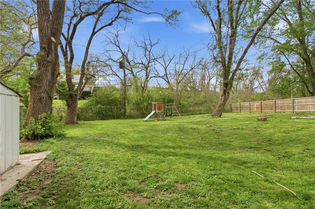Welcome home to this spacious ranch home located just 10 minutes from the new 2031 season Chiefs stadium! This home combines timeless quality updates with plenty of storage and living space, featuring 3 bedrooms and 1 bath on the upper level and a fourth bedroom, a fifth non-conforming bedroom, and second full bath in the finished walkout basement. The welcoming kitchen features a unique custom epoxy bartop overlooking the dining area. Walk out to the back deck and expansive fenced in backyard, perfect for yard games, firepit cookouts, and all your outdoor activities. You won’t want to miss this gem of a house! Please note that part of the garage has been converted to the dining area living space, so the garage is smaller than the typical garage space. It won't fit most trucks or standard sized SUVs.