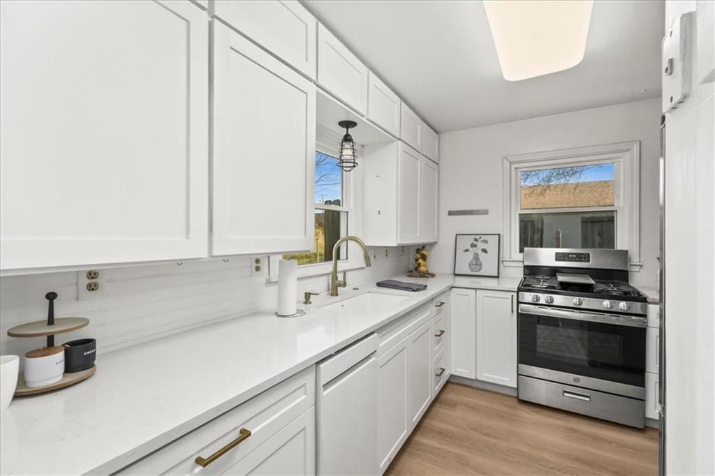 Discover your dream home in the heart of Independence, where classic charm meets modern luxury in this beautiful move-in ready ranch. Step inside to an open-concept living area that glows with natural light, highlighting the seamless luxury vinyl plank flooring that flows into an elegant eat-in kitchen. This chef-inspired space is a showstopper, featuring crisp white shaker cabinets, durable quartz countertops, and a sleek stainless steel appliance suite including a premium gas range. The attention to detail continues in the spa-like bathroom, boasting a stunning walk-in tile shower with a built-in bench, contemporary matte black fixtures, and a stylish marble-topped vanity. Outside, the property offers incredible versatility with a large level lot and a detached one-car garage perfect for a workshop or extra storage. Relax on the private back deck overlooking your spacious yard—an ideal setting for weekend gatherings or a peaceful morning coffee. Located in a quiet, established neighborhood with easy access to local amenities, this turnkey single-family home is a rare find for first-time buyers or those looking to downsize without compromising on style. Don't miss this opportunity to own a modern oasis with significant curb appeal and high-end finishes throughout.
