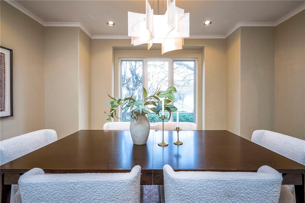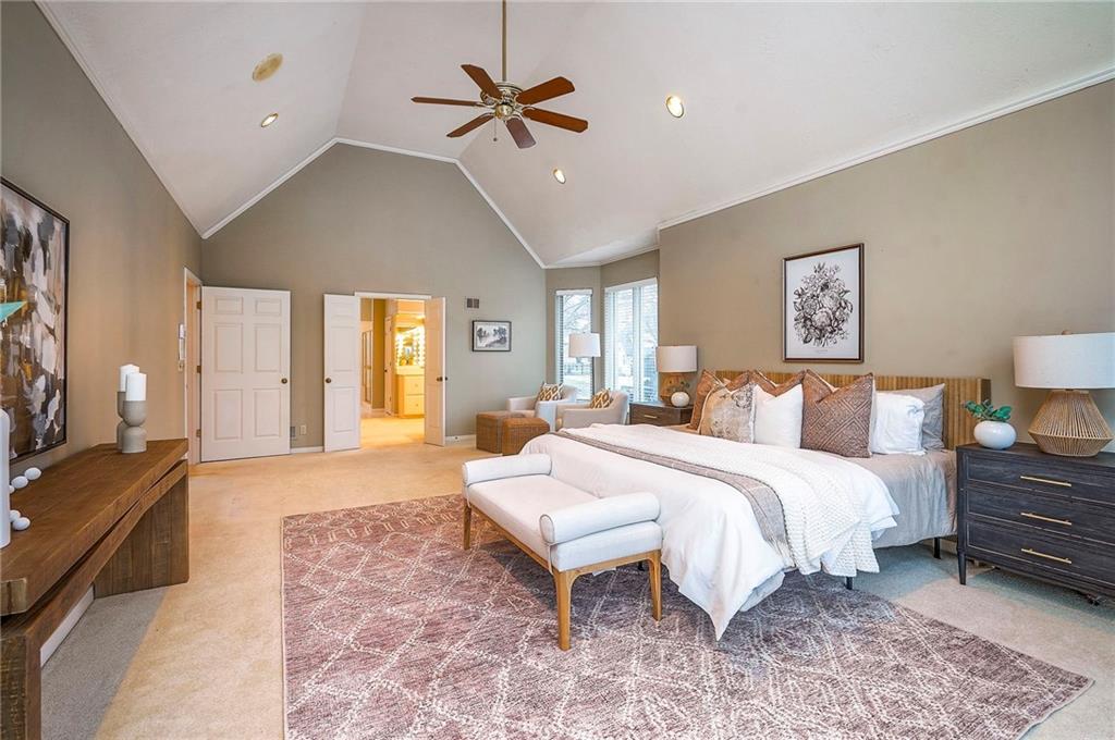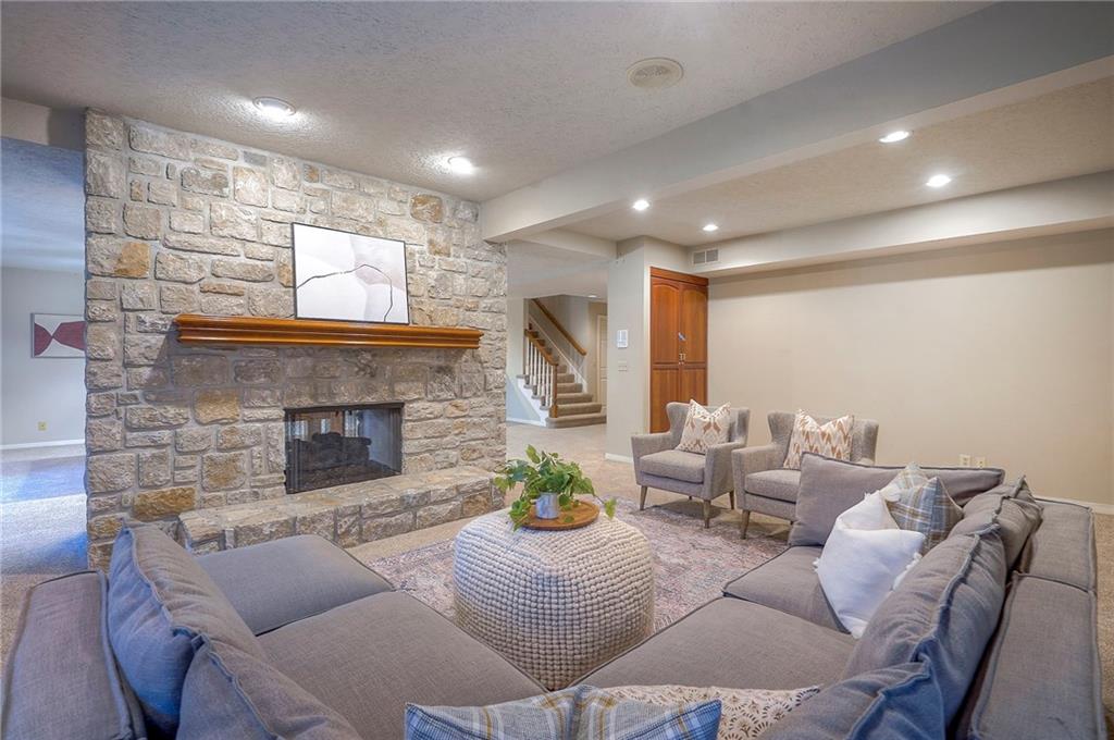 Welcome to this expansive and well-built 1.5-story home offering 4,224 square feet on the main & second floors, plus a large finished walkout basement with 1,500 finished square feet. The home sits on a beautifully landscaped lot in a prime Overland Park location. You’re greeted through a leaded glass front door from a charming courtyard into an impressive two-story entry, where a nearby three-story fireplace anchors the home & immediately showcases its grand scale. The main level features a spacious living room with wood beams, a fireplace & abundant natural light. A large formal dining room easily accommodates entertaining on a grand scale. The kitchen boasts several high-end Wolf appliances & a four-burner gas stove with a griddle. Just off the kitchen is an exceptionally large laundry room. The main-floor primary suite features a vaulted ceiling, generous closet space, and an en-suite bath with separate tub and shower and extensive storage. The second floor offers three very large bedrooms, excellent closets, and two and one-half bathrooms. The half bathroom could potentially become a second laundry room. There is also a bonus room featuring a wet bar, a fireplace and a large vaulted ceiling. It has the potential to serve as a second primary suite. The finished walkout basement is designed for entertaining, with a large bar, multiple gathering areas, wine storage, an additional bedroom and full bath, and access to a spacious patio. There is also significant unfinished space. Additional highlights include a huge deck overlooking the private lot, mature landscaping, a deep side-entry garage well-suited for large SUVs, trucks, and storage, zoned HVAC, partial HVAC replacement, and a major investment in several newer windows. This home offers a rare opportunity—exceptional bones, generous proportions, and a premier location with excellent schools, quick highway access, and nearby shopping and dining—ready for the next owner to bring their design vision to life.