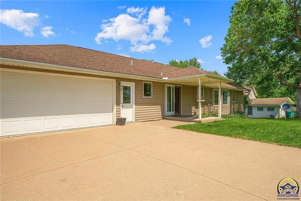 Welcome to this thoughtfully designed custom ranch-style home offering over 1,700+/- sqft of main-level living! Featuring 3 spacious bedrooms—including a split floor plan with the primary suite on one side and two additional bedrooms on the other—this layout offers privacy and comfort for the whole family. The heart of the home is the expansive kitchen, complete with custom oak cabinetry, upgraded storage solutions, double oven and all appliances, and pantry. Enjoy the convenience of a main-level laundry room and an attached 2-car garage with tons of overhead storage. This home was built with accessibility in mind, offering wide doorways and easy-flow spaces ideal for handicap needs. The full walk-out basement mirrors the main level with 9 ft ceilings and is already plumbed for a bathroom—perfect for adding bedrooms, a rec room, or even an in-law suite. Tons of potential for added space and equity, as well as a storm shelter for Kansas weather. Located just minutes from charming downtown amenities, the community pool, gas station, and local stores, with a quick commute to Topeka—this home checks all the boxes for comfort, space, and convenience! This home has been virtually staged to illustrate its potential.