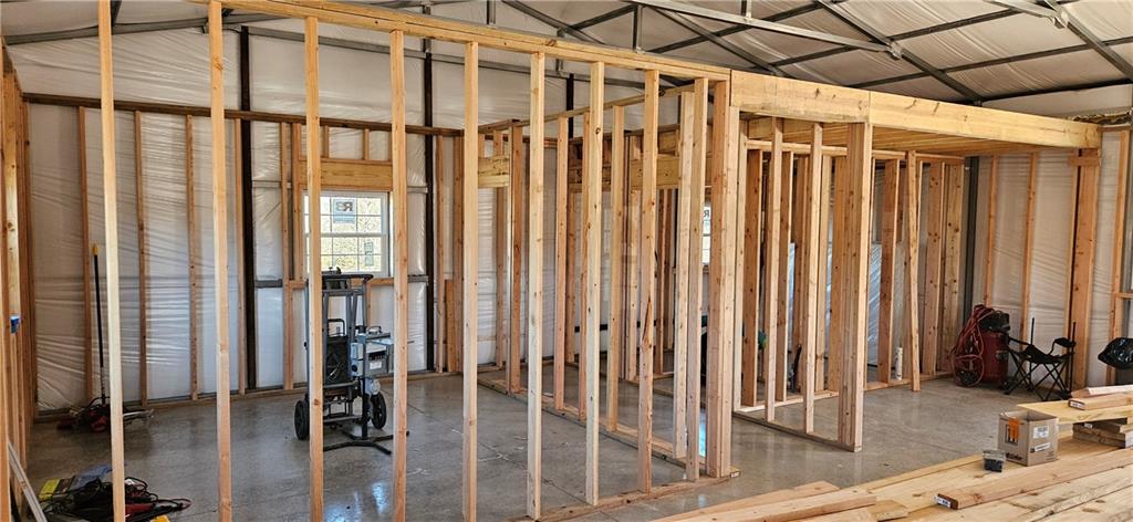 Cozy barndominium ready for your finishing touches! This metal barndominium is framed for a 1-bedroom, 1-bath open floor plan with a combined kitchen and living area. Features include a covered front porch, covered carport, storage shed, and a backyard fire pit—perfect for enjoying the outdoors. Electric service has been connected, and a water meter is scheduled to be installed. Located in the Linn Valley Lakes subdivision, owners enjoy access to amenities such as a community center, fishing, camping, boating, golf, abundant wildlife, and more.