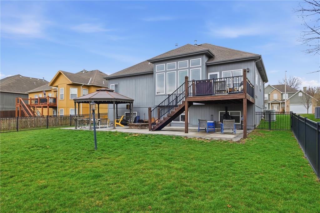 Beautifully maintained ranch-style home offering true main-level living in the heart of Kansas City. This inviting 3-bedroom, 3-bath home features an open and functional layout designed for both everyday comfort and entertaining. The main level showcases plantation shutters, a cozy gas fireplace with custom mantle, and abundant natural light throughout the living spaces. The spacious primary suite offers a relaxing retreat with double vanity, soaking tub, separate shower, and a large walk-in closet. A second bedroom, full bath, and main-level laundry provide convenient one-level living. The kitchen and bathrooms feature granite countertops, and all appliances stay—making this home truly move-in ready. Premium Karastan carpeting enhances comfort in the bedrooms and the finished daylight lower level. The finished basement expands your living space with a large rec room perfect for entertaining, movie nights, or game days, along with a third bedroom, full bath, walk-in closet, and generous storage area. Step outside to your private backyard retreat featuring a spacious gazebo with electricity, gas fire pit, aluminum fenced yard, and in-ground sprinkler system—ideal for relaxing evenings or hosting gatherings. Additional features include a Vivint security system and a 2-car garage. Move-in ready, thoughtfully maintained, and offering desirable main-level living with extra entertaining space—this home is a must see.