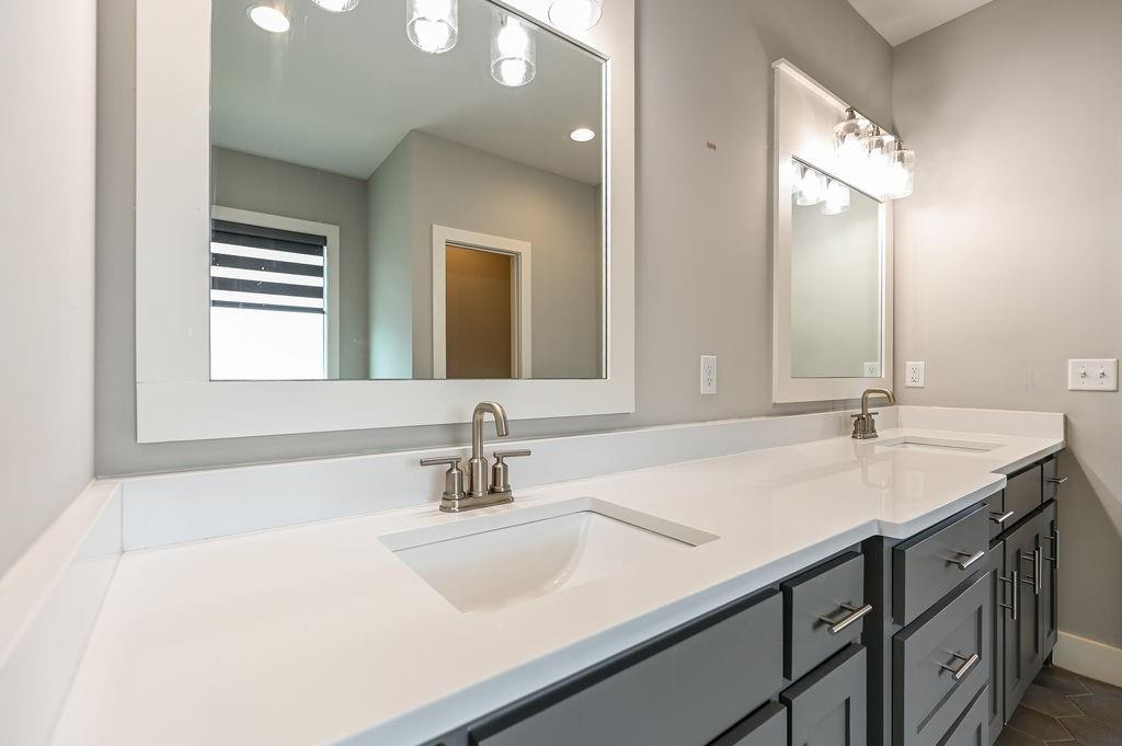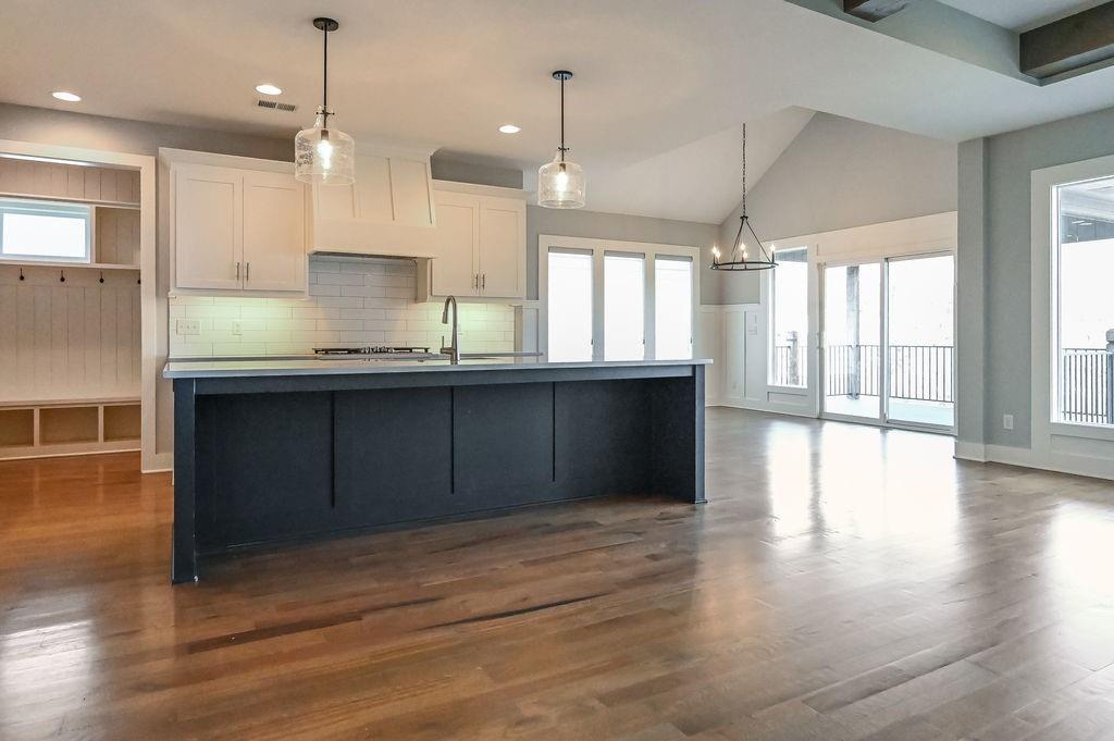 Enjoy main-level living in this stunning Reverse 1.5 Story, ideally located on a quiet cul-de-sac just steps from Lake Lenexa and the soon-to-be-completed neighborhood amenity center. Backing to treed greenspace, this home offers privacy, scenic views, and easy access to trails and community amenities. The open kitchen and dining area are designed for both everyday living and entertaining, featuring custom cabinetry, a large island, walk-in pantry, and direct access to the covered deck—perfect for grilling, relaxing, or outdoor dining. The main-level primary suite includes a spacious bedroom, spa-inspired bath, oversized walk-in closet, and conveniently connected laundry. A second main-floor bedroom and full bath provide flexibility for guests or a home office. The walkout lower level expands your living space with an oversized recreation room, large windows overlooking the trees, and a finished wet bar ideal for hosting or movie nights. Two additional bedrooms each have private baths, offering comfort and privacy. Notable features include a reinforced concrete storm shelter, dedicated electrical for a patio hot tub, and EV-ready wiring in the garage. Located in desirable West Lenexa with HOA amenities including pool, trails, play area, and more. All offers will be considered. A rare blend of location, design, and functionality—this home is a must-see.
