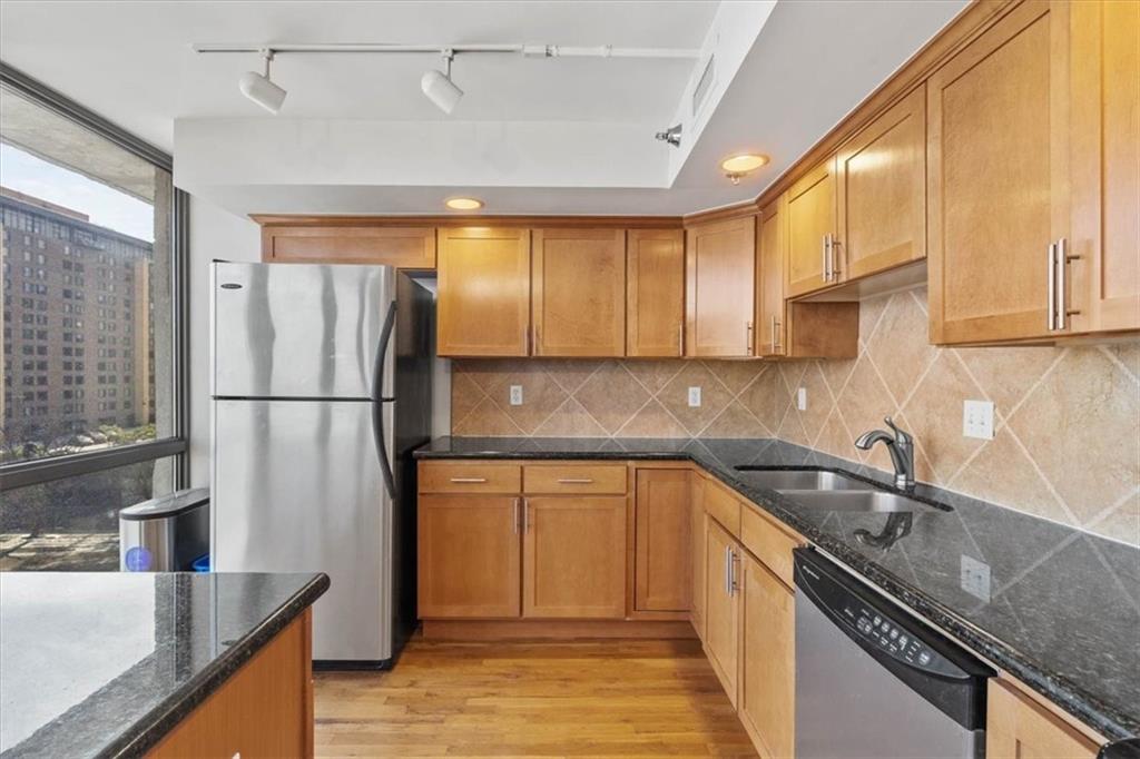 Bright, cheerful, and full of good vibes, this is the kind of place that makes you smile the moment you step inside. Drenched in sunlight, it features a full window wall that frames the city, has sensational amenities, a tax abatement, and a coveted outdoor space you will adore. The layout is open, airy, and thoughtfully designed to maximize space. The kitchen is well-equipped with today’s conveniences, generous cabinetry, granite counters, and a central island that anchors the room. Steps to the living area, it’s perfectly suited for casual entertaining, cozy nights in, or simply enjoying the sunset while dinner comes together. Hardwoods add warmth and continuity throughout, while the balcony provides the ultimate spot to start or end the day. The bedroom offers a serene escape, filled with natural light and expansive windows that keep the skyline in view, complemented by an ensuite that blends style with everyday function. Thoughtful extras include in-unit laundry, two parking spots (one in the garage and one surface), and additional storage for your convenience. The amenities go above and beyond, with pools, hot tubs, and basketball courts. Hit the gym, unwind in the sauna, or stretch and strengthen in the yoga room. Add a tennis/pickleball court, a club room, a movie theater, an executive kitchen, and a garden for quiet escapes. There is even a laundry service and a 24/7doorman. Perfect as a first home, city retreat, or investment property, this charming condo offers the complete package just moments from all the downtown action.
