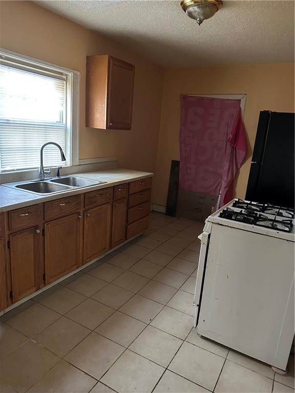 Kitchen with white gas range oven, a textured ceiling, light countertops, freestanding refrigerator, and wood finish cabinetry