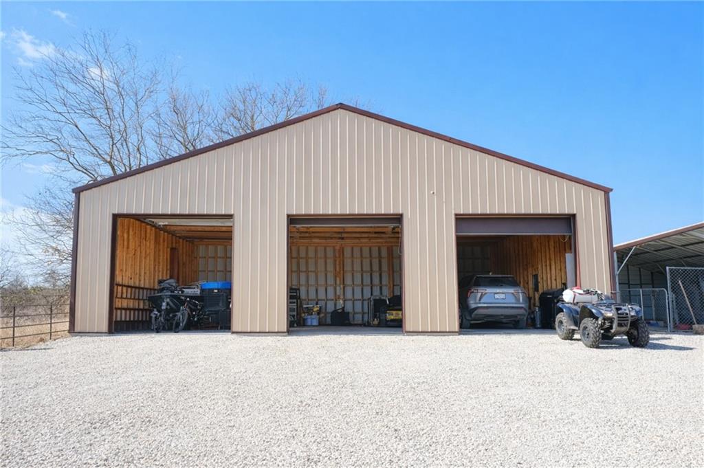 Discover the perfect blend of country living and modern convenience with this impressive 2,560 sq ft barndominium set on 11 beautiful acres. This spacious home features 4 bedrooms, 2 bathrooms, and an office, offering plenty of room for both everyday living and working from home. The primary suite includes a massive walk-in closet and an en-suite bath with a private toilet room for added comfort. The spacious kitchen and living area are ideal for entertaining, complete with a large island, dishwasher, and stainless steel appliances. Just off the kitchen, you’ll find a mudroom/laundry room equipped with a water softener. Enjoy peaceful outdoor living on the covered patio that wraps around the front and side of the home, or relax by the above-ground pool with a deck. The property also features a newly built, fish-stocked pond and a storm bunker located near the house. This property is exceptionally well-equipped with six additional structures. The standout is a 40’ x 60’ climate-controlled shop with 16’ walls, three garage doors, a vehicle lift, compressor, washer and dryer, and ample space to store a camper or RV. Across from the shop is a 45’ x 32’ garage with 12’ walls, three garage doors, and a side entry door. Adjacent is a 20’2” x 25’ carport for additional covered parking. For agricultural or hobby use, the property includes a 30’ x 40’ barn with 10’ walls, gravel floor, walk-in side door, and front sliding door, plus a 20’ x 40’ lean-to with dirt floor. There is also a 60’ x 14’9” hay barn with 11’8” walls and a gravel floor. Next to the shop, a cozy cabin used as a game room (Games come with property) offers heat and air, carpet flooring, and versatile space for guests, recreation, or a private retreat. With room to roam, extensive improvements, and endless possibilities, this unique property is ready to fit a variety of lifestyles. Buyers are encouraged to verify all measurements and details to their satisfaction. Property is being sold as-is.