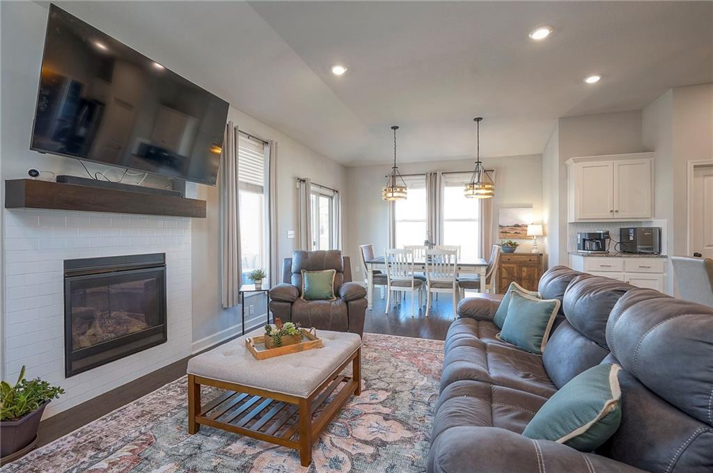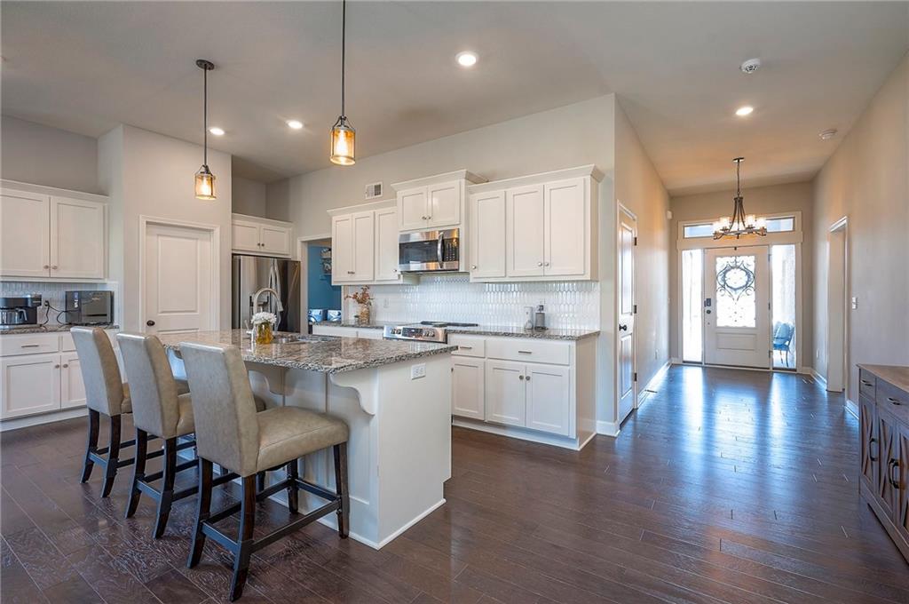 Beautiful ranch in Foxwood Ranch featuring an open floor plan with all 3 bedrooms conveniently located on the main level. The luxury kitchen showcases painted cabinetry, granite countertops, tiled backsplash, wood floors that flow through the kitchen, dining area and great room, plus upgraded brushed nickel plumbing fixtures for a modern touch. Enjoy outdoor living on the 14x10 covered patio with an extended stamped concrete patio, and irrigation system. Maintenance-provided living covers lawn care, fertilizer treatments, sprinkler system maintenance and snow removal. Additional highlights include a 3-car garage and a prime location just 10 minutes to Garmin or I-35, minutes to Sycamore Ridge Golf Course and Hillsdale Lake, and just a few blocks to Wolf Creek Elementary and Spring Hill High School. Community amenities include a state-of-the-art pool, clubhouse, playground and scenic trails — offering comfort, convenience and low-maintenance living all in one. Basement is ready for your design as it includes an egress window and is stubbed for a bathroom.