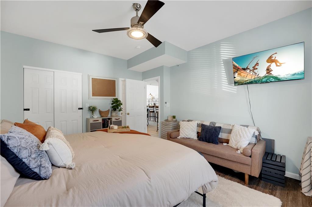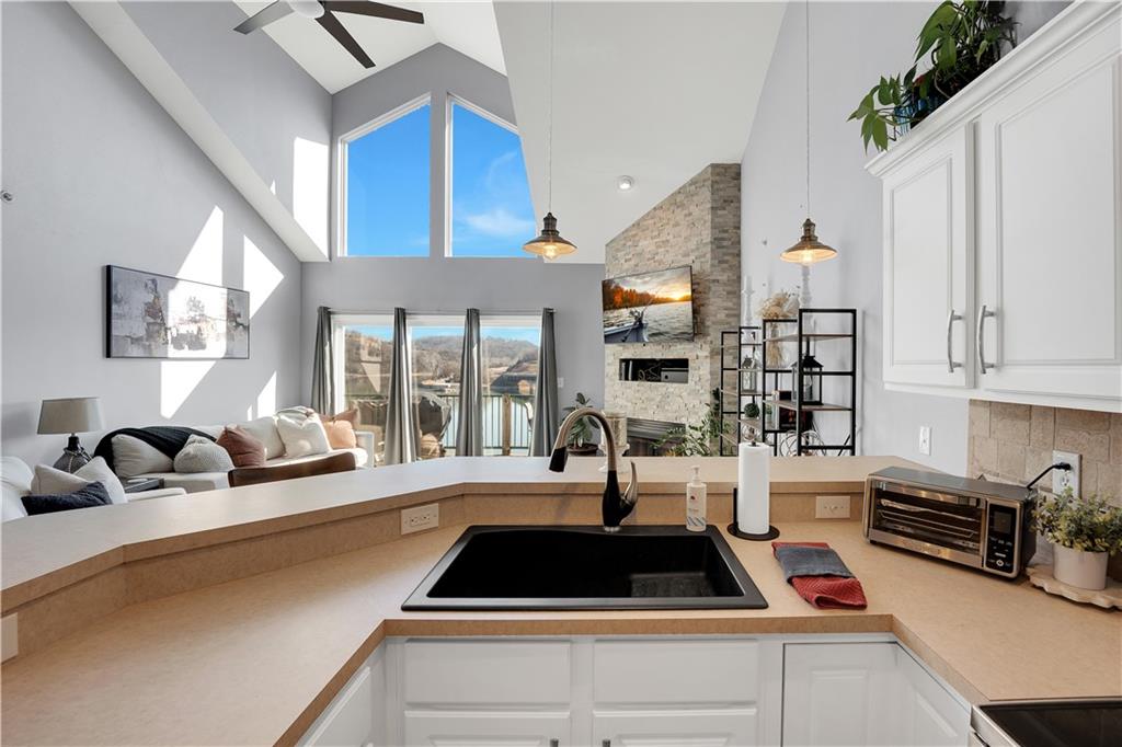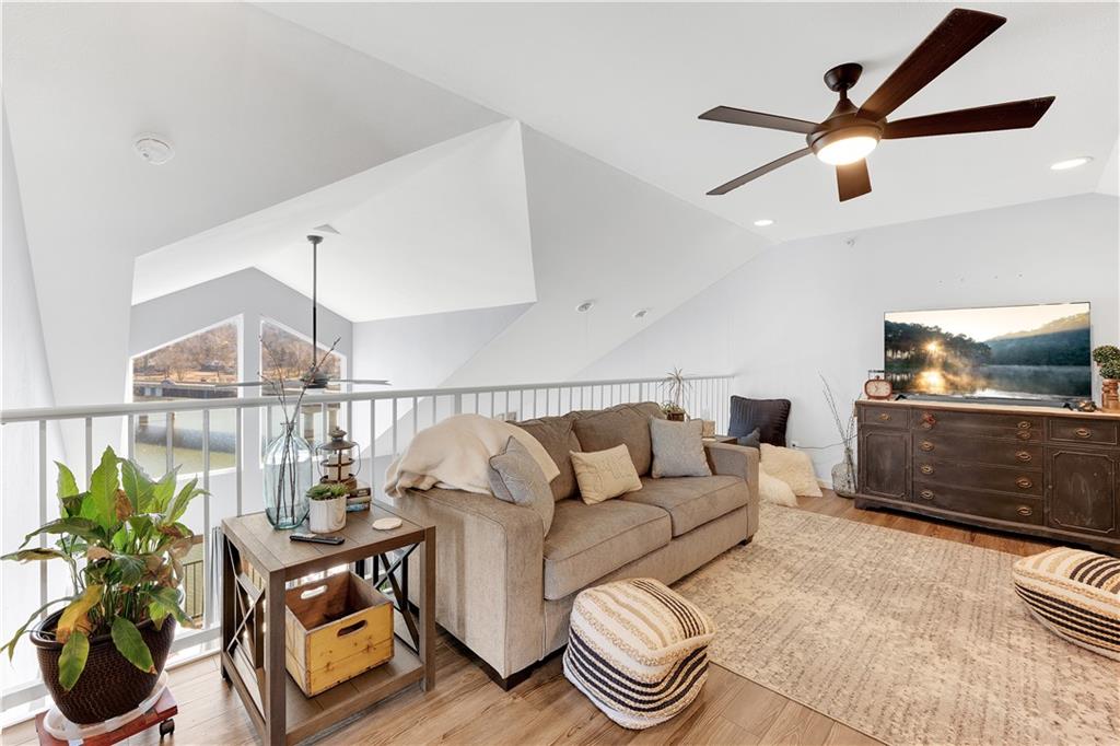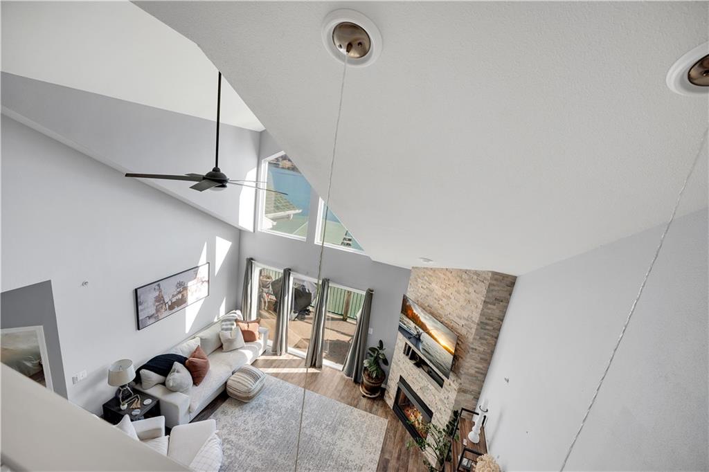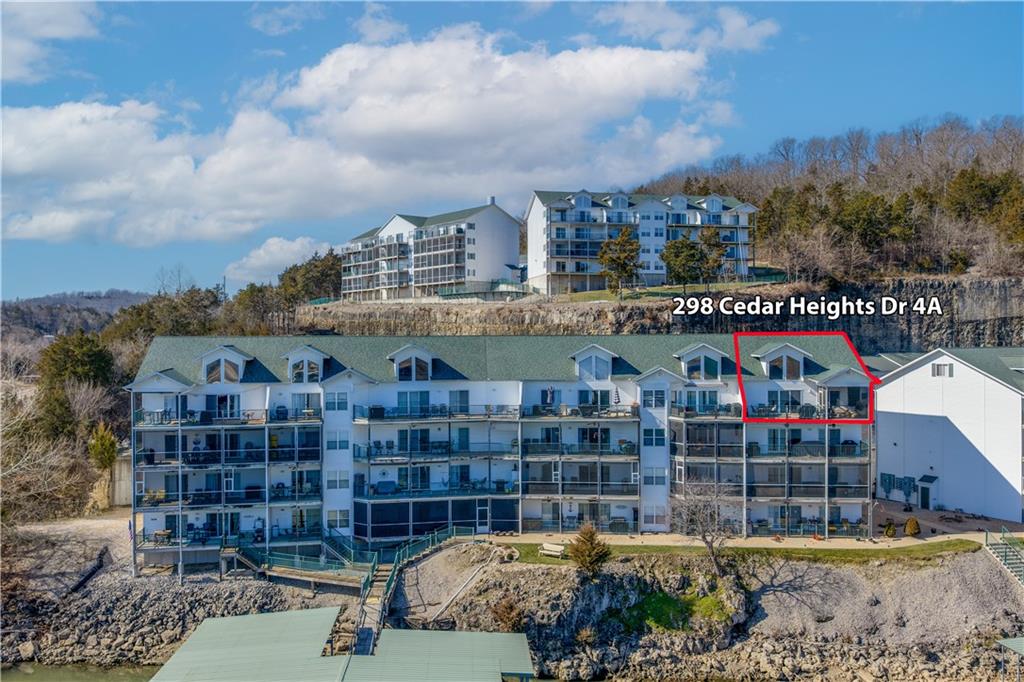 Experience lake living in this 4-bedroom, 2-bath penthouse condominium offering approximately 1,923 square feet in the Cedar Heights community. The open layout features vaulted ceilings, abundant natural light, and a stone fireplace. Enjoy two outdoor spaces, including a screened deck and an open sun deck for relaxing and taking in the surroundings. The kitchen offers stainless steel appliances, a spacious peninsula, and tile backsplash. The primary suite includes vaulted ceilings, a walk-in shower, and walk-in closet. A second bedroom connects to a Jack-and-Jill bath, with an additional main-level bedroom. The upper-level loft provides a flexible living area plus a fourth bedroom with walk-in closet and plumbing for a potential third bath. A 12x30 boat slip is included. Community amenities include three swimming pools and maintained common areas. Convenient access to golf, dining, shopping, entertainment, and Ballparks National. Seller will pay all levied special assessments prior to closing. Nightly rentals permitted per community guidelines. This property is offered furnished for a turn key experience. Some antiques and personal items are not included. Don't miss this opportunity for a great lake condo!