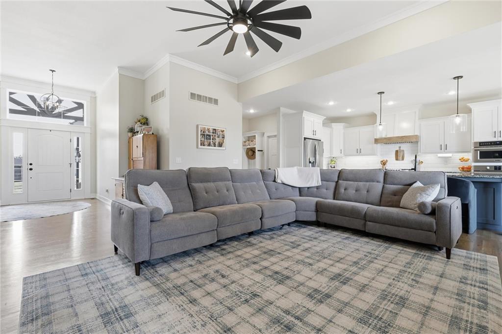 Welcome home to this beautifully upgraded property that perfectly blends style, comfort, and functionality. Step inside to find gorgeous wood floors throughout the main level living space, creating a warm and inviting atmosphere. The spacious living area features a stunning electric fireplace with color-changing LED lights, offering both cozy ambiance and a modern focal point. The kitchen is designed to impress with an oversized island, gas range, double ovens and granite countertops throughout — ideal for entertaining and everyday living. Thoughtful upgrades continue into the bathrooms, where you’ll find floor-to-ceiling tile in every shower/bath. The luxurious primary suite features a zero-entry shower with dual shower heads and corner seat, combining elegance and convenience. The lower level is perfect for entertaining with a designated bar space, LVP flooring was added in May 2025, and for added peace of mind, air ducts were professionally cleaned in October 2025. Additional improvements include buried downspouts and french drains to enhance drainage and functionality. Outdoor living truly shines here. The fenced, walkout lot backs to a shared green space and offers peaceful lake views. Enjoy morning coffee or evening sunsets from the large covered deck with Trex decking, built for durability and low maintenance. The stocked lake provides fishing opportunities just steps from your backyard — a rare and special feature. This home offers upgraded finishes, thoughtful improvements, and an unbeatable setting — the perfect place to relax, entertain, and enjoy life.