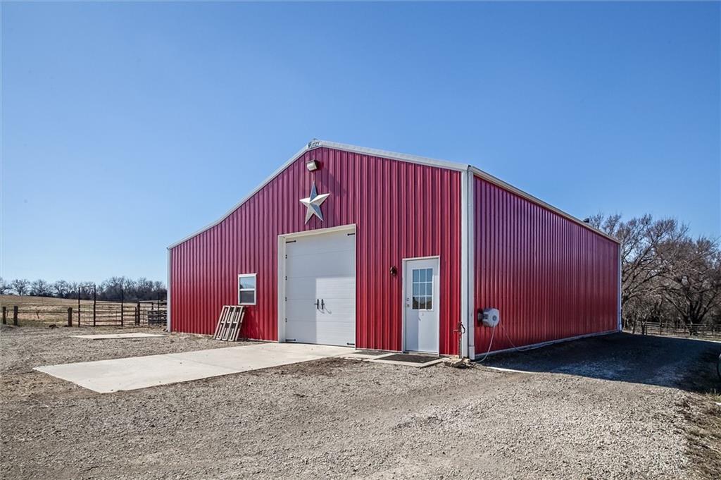 Gorgeous dream home located on 20 +/- picturesque acres. Expect to be impressed upon entering this 4 bedroom, 4 bath ranch. Open floor plan, reclaimed hardwood floors throughout main living area, vaulted ceilings, an abundance of natural light, solid wood doors and upgraded lighting. Great room featuring floor to ceiling stone fireplace, open to stunning kitchen boasting GE Cafe appliances, custom cabinetry with marble pulls and knobs, granite countertops, pot filler, gas stove and walk-in pantry. Large island and dining space to accommodate all of your family and friends making it perfect for hosting gatherings. Step outside to your private deck for enjoying the fabulous sunsets. Great master suite with vaulted ceiling, double vanity, separate shower, relaxing soaking tub and huge walk-in closet. Two additional spacious bedrooms on main level as well. Full finished walk-out lower level complete with wet bar, huge family/rec room, plenty of windows, 4th bedroom, full bathroom, safe room, plus unfinished space for storage. The property also features a 30x50 insulated shop with 200 AMP power, concrete floor, large wood burning stove, 2 separate garage doors (in/out) plus three 16x20 bays with lighting. Newly added 30x34 2 stall stable with commodity area and 30x10 lean to for additional equipment storage or animal cover. The cutest custom chicken house stays too. This remarkable property is not only beautiful, but it virtually has it all! Perfect farm space for cattle or horses, abundance of wildlife, trails through the timber down by the creek and fish in the pond. It is a sanctuary retreat by day and night all year long! Serene environment to call home! All located on hard-surface road. Easy commute to Lawrence, 15 minute commute to Baldwin City and Topeka!