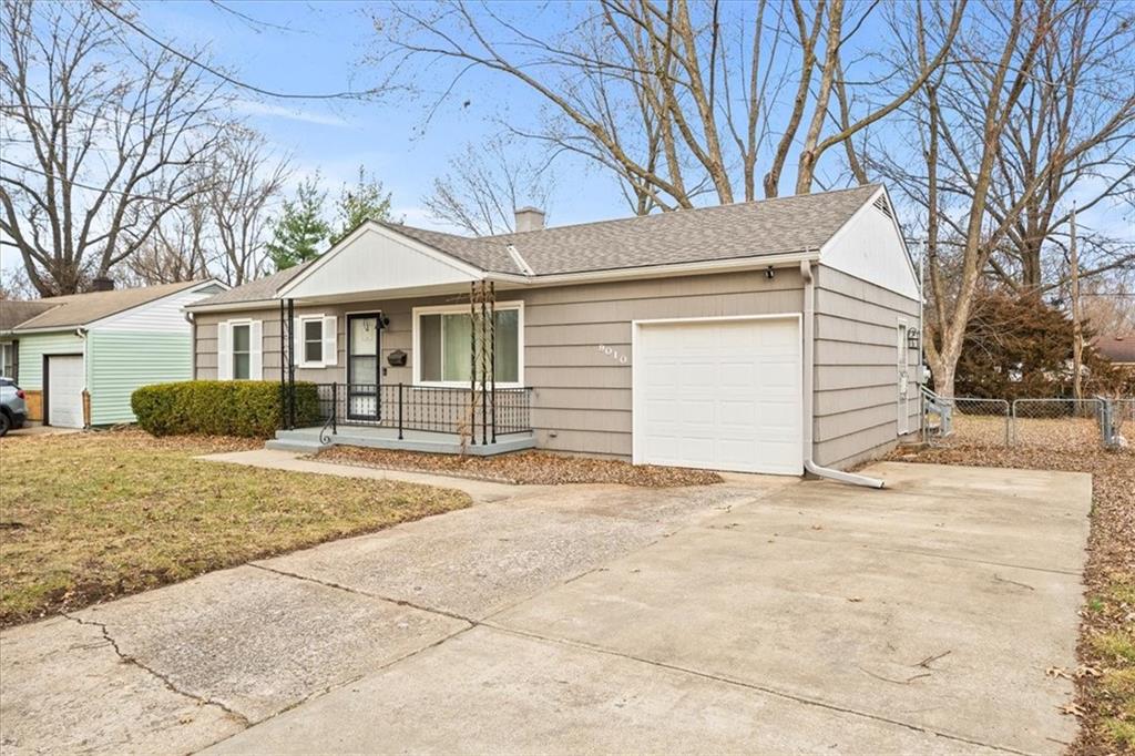 Wonderful 3 bedroom, 1 bath ranch located in a well establish neighborhood! This charming home features a roof just 1.5 years old and an inviting front porch that welcomes you as you arrive. The extra wide driveway provides ample parking for multiple vehicles. Inside you'll find a bright living room filled with natural light and a functional kitchen offering abundant cabinetry and generous counter space. All appliances stay, including the refrigerator, washer and dryer-making this home truly move in ready. The basement provides tons of storage space, complete with built in shelving and a workbench area. Step outside to a large fenced backyard featuring a spacious deck with built in seating, access on both sides of the yard, raised garden beds for future gardeners, and a bonus storage shed. Conveniently located just minutes from Raytown schools, walking trails at Cave Spring Park, shopping, and highway access. A wonderful opportunity for first time homebuyers or anyone looking for comfortable, easy living!