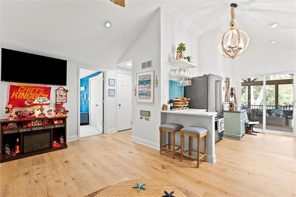 Experience lakeside living at its finest in this charming Lake Lotawana cottage. Perfectly positioned on a spacious .24-acre corner lot with its very own private dock with a boat lift, this home combines modern luxury with the serenity of nature. Step inside to vaulted ceilings and a thoughtfully updated interior featuring quartz countertops, stainless steel appliances, stylish backsplash, and contemporary fixtures. Fully renovated bathroom & two comfortable bedrooms make the perfect place to unwind. A large screened porch opens seamlessly to an expansive deck—ideal for entertaining—while the backyard fire pit provides a cozy setting for evenings under the stars. Surrounded by mature trees and tranquil views, this property embodies peaceful lakeside living. Whether as a weekend getaway or a year-round residence, this cottage captures the true Lake Lotawana lifestyle, from quiet mornings spent fishing, to afternoons on the boat, to evenings entertaining family and friends.