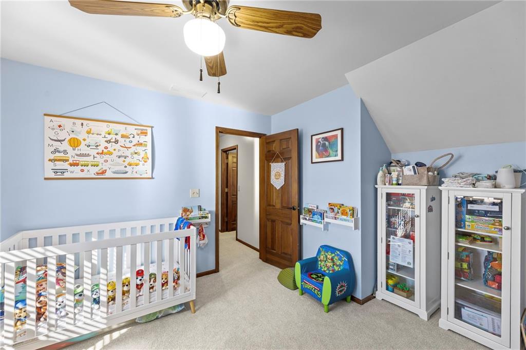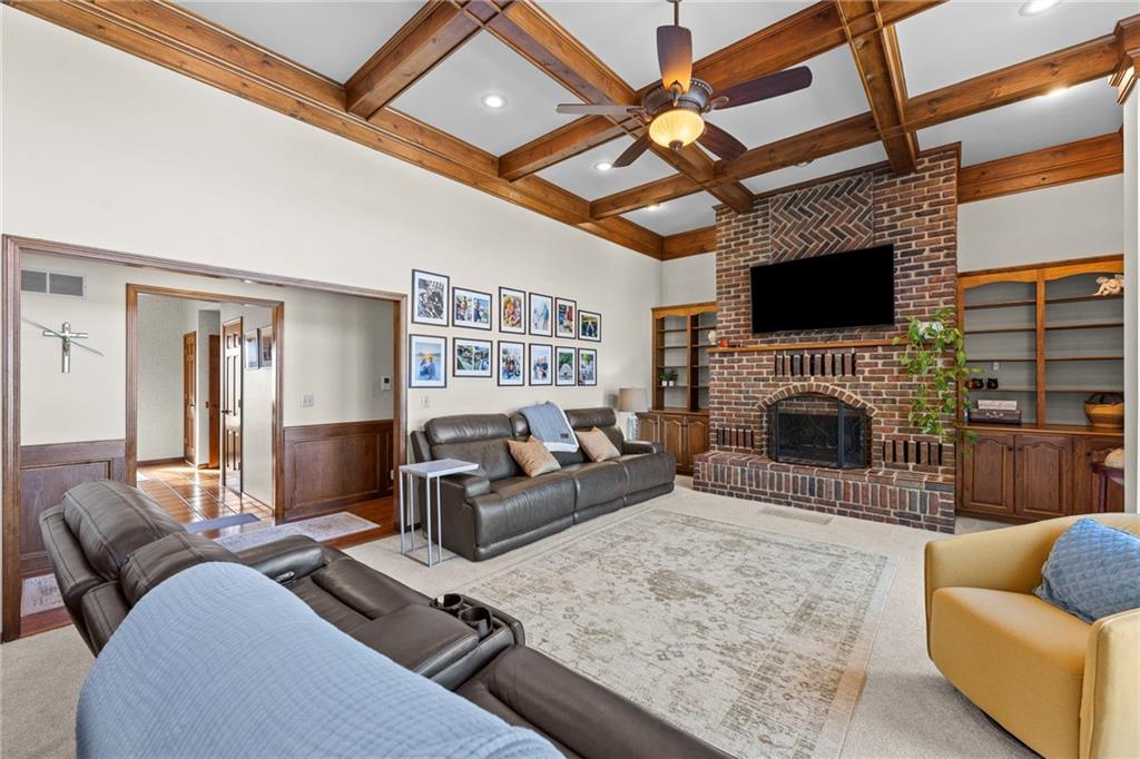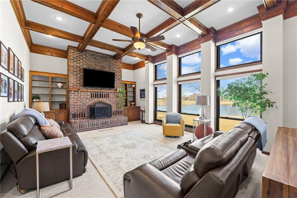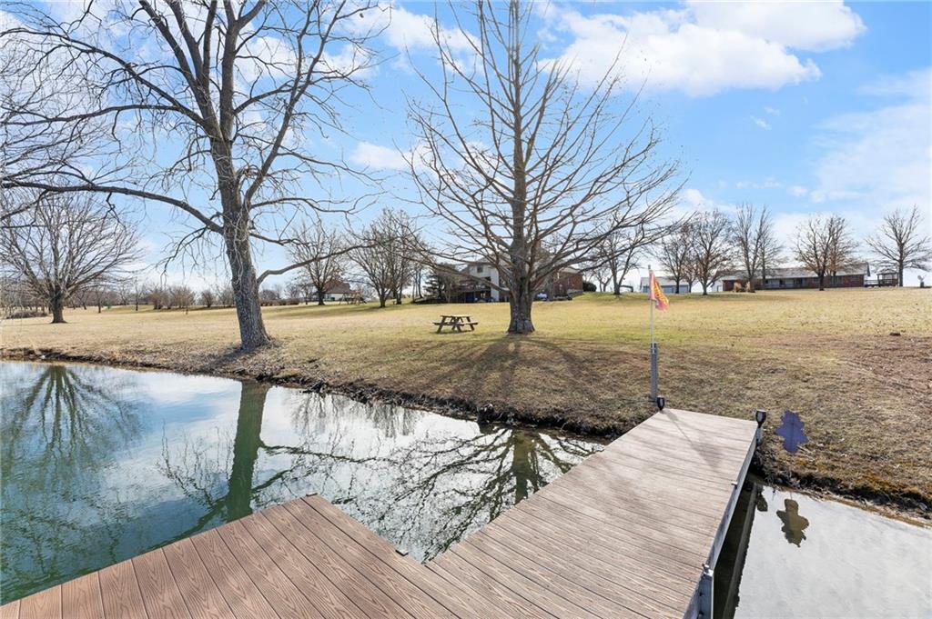 Nestled on 4.95 lush acres just north of the Paola Country Club, this exceptional custom-built 1.5-story residence offers a rare blend of superior craftsmanship and tranquil lakeside living. The heart of the home is a gourmet kitchen finished with rich walnut cabinetry, granite countertops, and warm oak hardwood floors, which flows seamlessly into a magnificent great room where walls of windows frame breathtaking views of a 2-3 acre stocked shared lake. Architectural integrity shines through the 6-inch wall construction, Anderson windows, and a high-impact resistant roof, while the interior showcases refined details like a custom-designed pecan study with solid core doors and two fireplaces. The main-floor primary suite serves as a private sanctuary with vaulted ceilings, walk-in closets, a shower and granite double vanities with Kohler fixtures. Upstairs, three additional spacious bedrooms share a beautifully updated full bathroom, ensuring comfort for family or guests. The versatile walkout lower level extends the living space with a bright family room, den, and a dedicated 24x13 workshop, all leading out to a sprawling yard, perfect for entertaining. Enjoy the fruit trees, blackberry bushes, strawberry and asparagus patches, plus a 30 ft. x 12 ft. garden area. Situated on a quiet dead-end road, this meticulously maintained brick frame and stone trim estate provides a serene escape without sacrificing proximity to local amenities.
