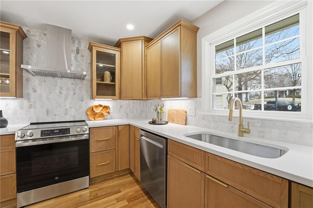 STUNNING REMODEL IN THE HEART OF LEAWOOD! Welcome to this beautifully reimagined home where thoughtful design meets modern luxury. Soaring vaulted great room steals the show with its dramatic floor-to-ceiling stone fireplace and abundance of natural light, creating a warm yet striking focal point. Entertain with ease in the dream kitchen, designed for gatherings and everyday living alike, offering quartz countertops, center eat-in island, stainless steel appliances including built-in microwave/oven combo and stove with second oven, bar area and pantry with seamless flow to the dining and living areas. Step outside to the expansive composite deck, perfect for relaxing evenings or hosting guests. Main level features two spacious bedrooms, including a serene primary suite complete with a spa-like bath, oversized walk-in closet with convenient washer/dryer hookups for true main-level living. Full, finished walk-out lower level expands the living space with a huge family room, wet bar, two additional bedrooms, third full bath and a second laundry area, making it ideal for guests, multi-generational living or added convenience. Tons of built-in storage spaces to keep life organized! Fantastic location close to dining, shopping, parks and activities. This exceptional renovation blends style, comfort and functionality in one of Leawood’s most desirable locations—truly a must-see! WELCOME HOME!!!