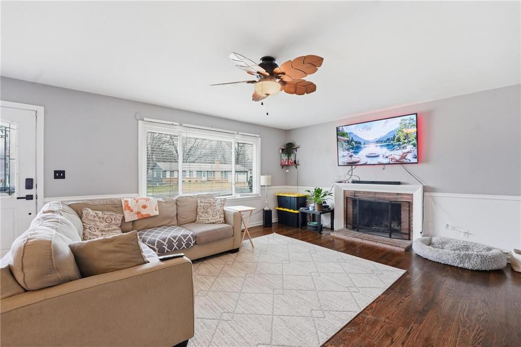 Warm and welcoming 3-bedroom ranch with 2 full baths, spacious 2-car garage. A convenient door from garage opens to a large, level, fenced backyard, featuring a partially covered patio area, bricked around the edges and perfect for quiet mornings as the sun rises, evening gatherings without the heat of the sun, or simply relaxing outdoors. A separate back door leads into the home. Inside, the original 1956 hardwood floors add timeless character and mid-century charm throughout. You'll find a comfortable, spacious living room, a dedicated dining area and an updated kitchen with brand new appliances and painted cabinets The washer and dryer stay, adding to your convenience. The three bedrooms, one a primary with full bath, complete the main level in this charming home. The lower level offers over 500 additional finished square feet of living space, including a welcoming family room and a non-conforming fourth bedroom, perfect for guests, a home office or a hobby space. All upstairs windows have been replaced recently, adding natural light and efficiency. Owner also added new railing to the front entrance.