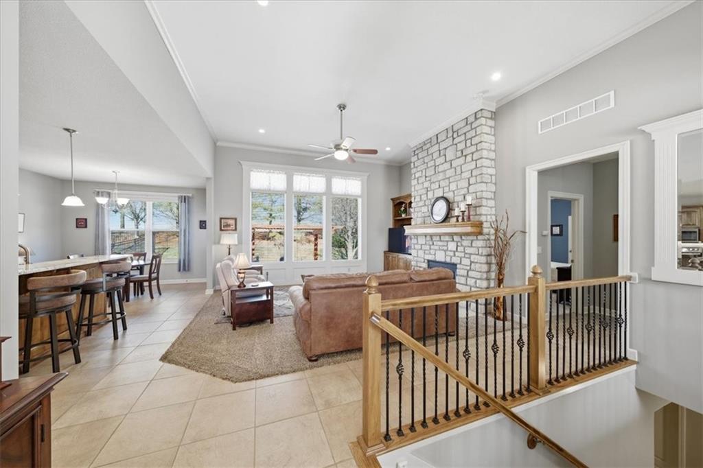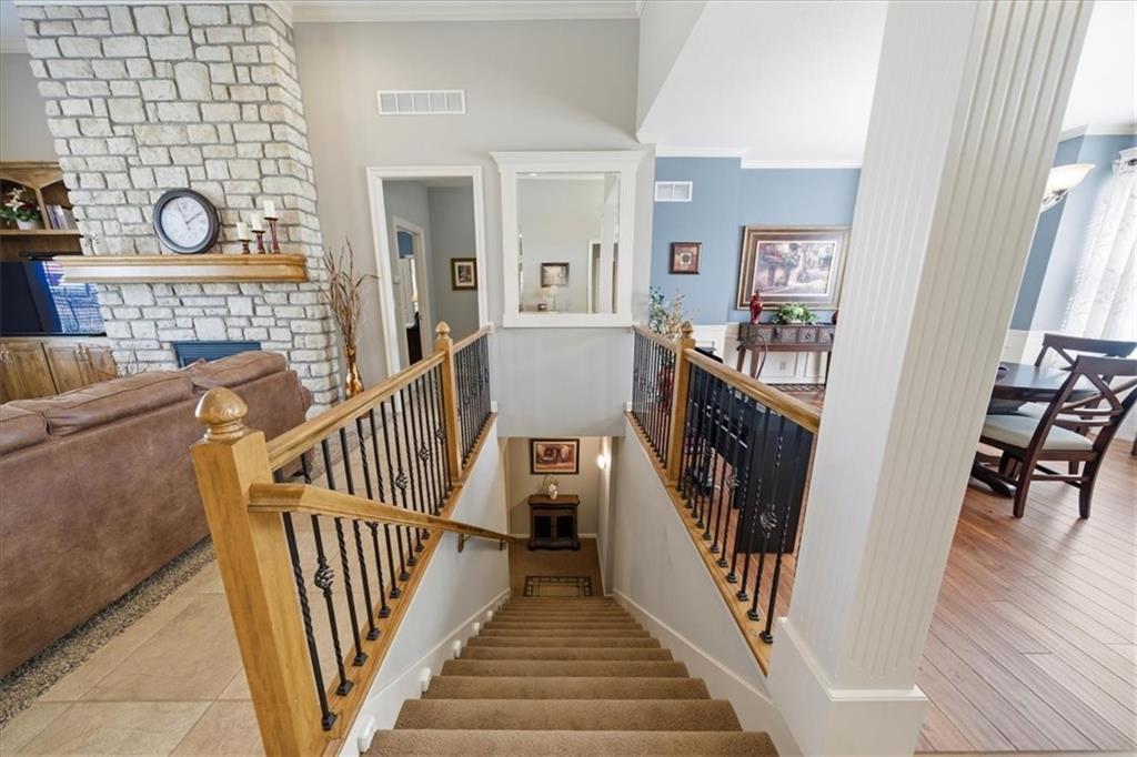 It's rare but oh, so exciting to discover a home that has been this impeccably maintained - few homes can match the care and cleanliness this one has received and you'll recognize it just as soon as you pull up to the front curb. Important details have been thoughtfully improved - from the concrete extension providing a full 3-car wide driveway, to the motion-detecting staircase lighting, to the newly refreshed primary bath and kitchen, to the regularly cleaned gas-log fireplace, and to the BRAND NEW HVAC! And that's just the start of what you'll love about this beautiful home. You'll be mesmerized by the stone-to-ceiling fireplace, not to mention the cozy warmth of its flip-of-a-switch realistic flames and embers. You'll appreciate the timeless architectural trim detailing through every room and the plush new carpet in the main level bedrooms. You've found the unique reverse floor plan offering a true dining room that is just as comfortable as an open dining space for enjoying leisurely meals with family and friends as it is a happy music room with a baby grand piano.