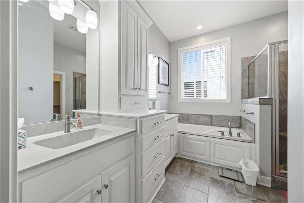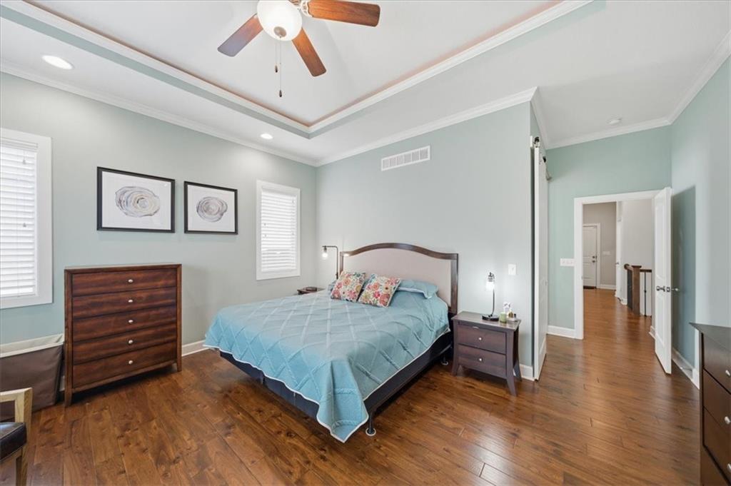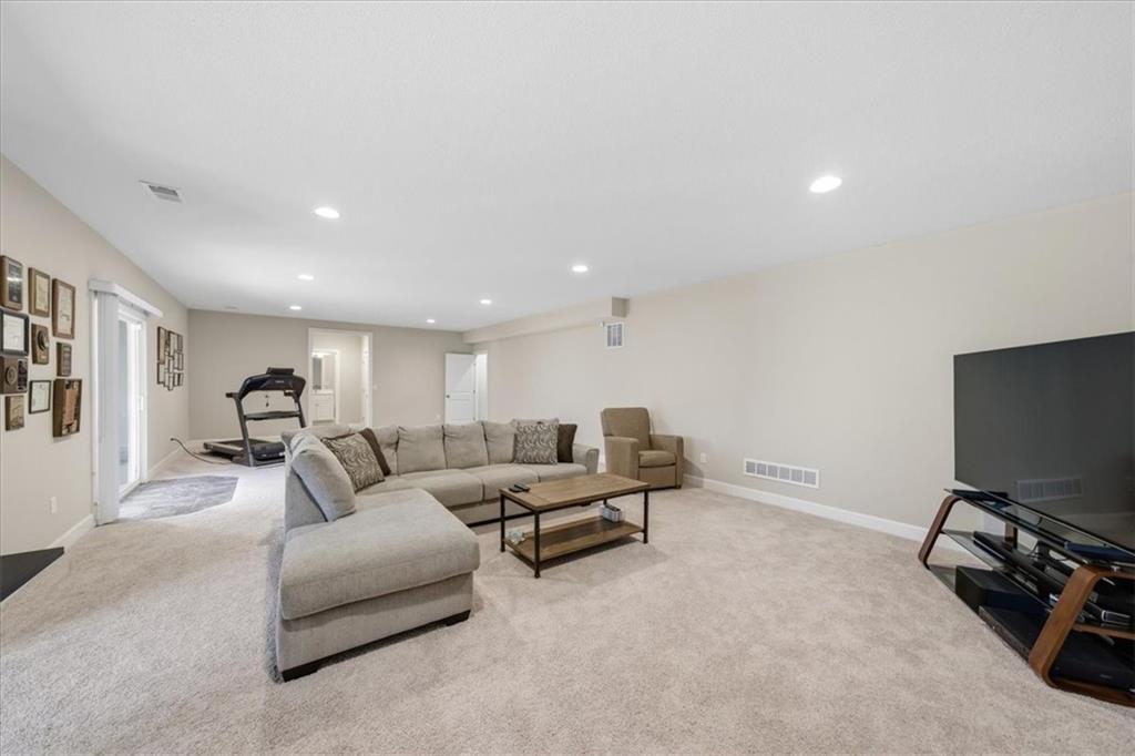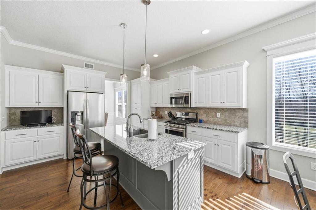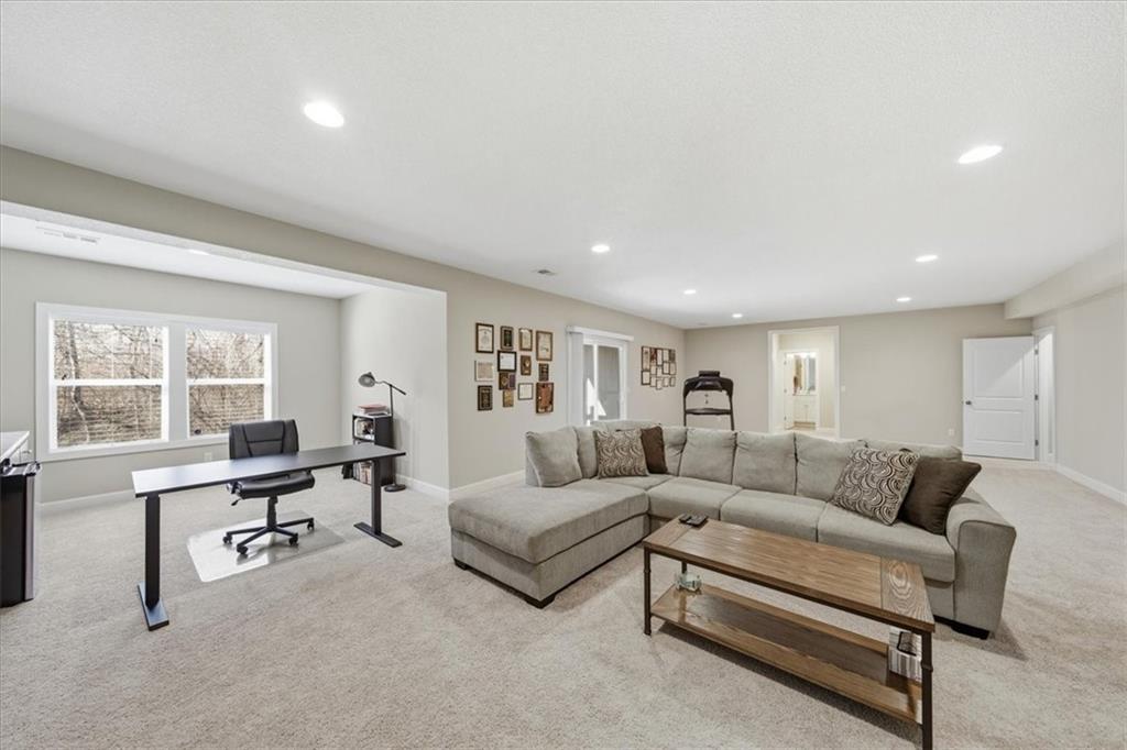 This beautifully maintained 4-bedroom, 3.5-bath ranch-style home is located in The Enclave at Shoal Creek Valley. The thoughtfully designed main level features three bedrooms, a private office with French doors, formal dining room, and a breakfast nook. Interior highlights include custom built-ins, extensive crown molding, and additional recessed lighting throughout the main living areas. The kitchen is equipped with granite countertops, a gas range, and under-cabinet lighting. Engineered hardwood flooring extends through the kitchen, foyer, great room, and primary bedroom. The primary bathroom offers a sliding barn door, custom cabinetry, and a soaking tub. The finished walkout lower level includes an additional bedroom, full bathroom, expansive family room, and wet bar—ideal for entertaining. The home backs to a wooded preserve, offering scenic natural views from the covered, stained deck and lower-level patio. Additional upgrades include high-efficiency blown-in insulation, a LeafFilter gutter guard system, epoxy-coated garage floor, insulated garage doors, and a utility sink in the garage. Age: 8.5 years (Original owners; purchased new on October 1, 2017) Total Finished Living Space: 3,415 sq. ft. Main Level: 2,345 sq. ft. Lower Level: 1,070 sq. ft. HOA Dues: $146/month ($1,750 annually) Gated entry with access to community pool Clubhouse and water park amenities