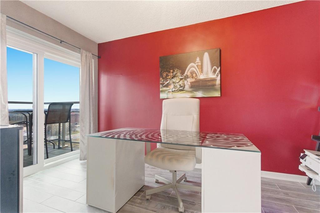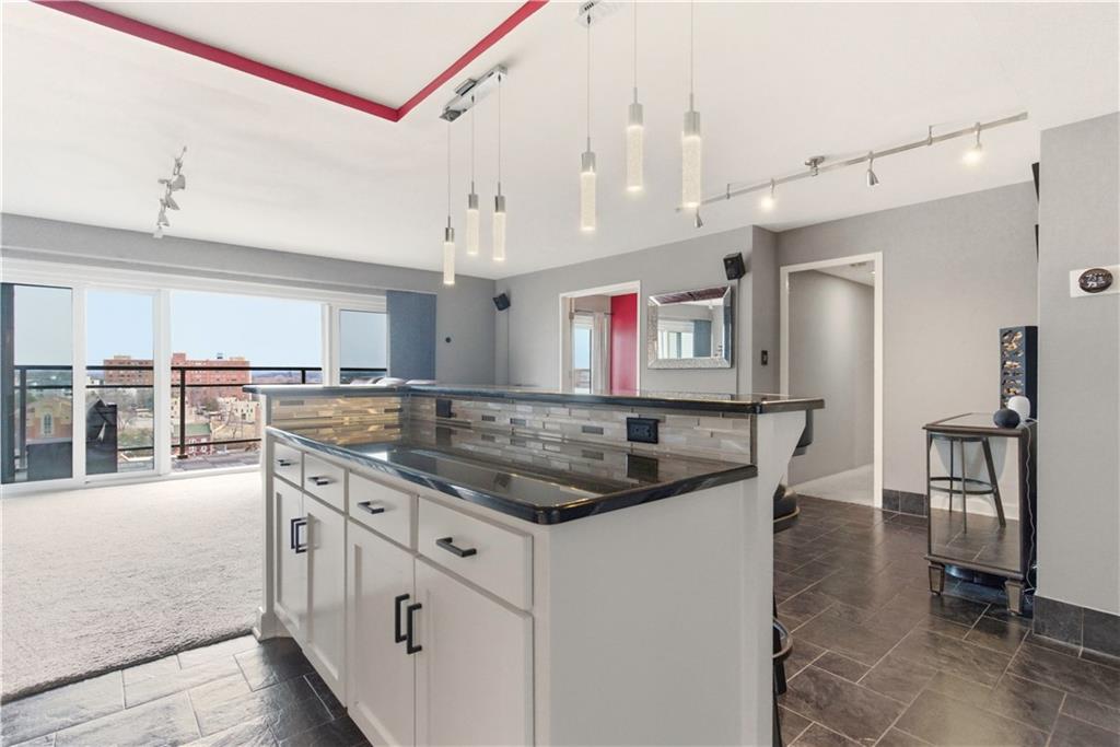 Perched on the 11th floor, this seldom offered unit with a 30' balcony has unparalleled views of Mill Creek Park and the Plaza skyline. Five-minute walk to hop on the streetcar to Downtown KC or Power and Light!! Completely renovated and turnkey, this is your opportunity to enjoy maintenance free living in a fabulous Plaza location and includes a coveted covered garage space for your vehicle. This darling unit won't last with all the upgrades the Owners have put in including Hunter Douglas automatic shades, remodeled kitchen with granite and bar, office with access to balcony, updated bathroom and more! This building has 24 hour front door security and amenities which include exercise room, hobby room, mail room, parking and multiple party spaces. Water, trash, heating and cooling are included in HOA fee. Storage space comes with unit. Unbeatable location with walking distance to everything you might possibly need! Don't wait to check this one out!