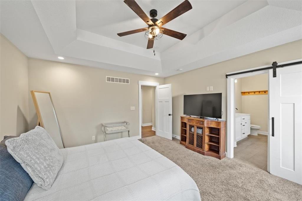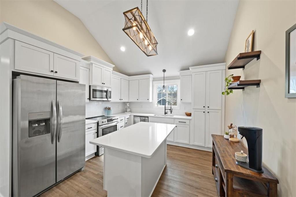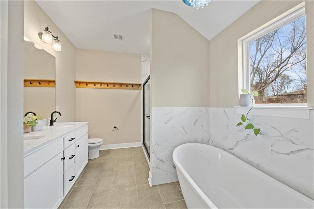 Stunning Newer Construction with Vaulted Ceilings and Designer Finishes! Skip the wait of building and move right into this 2023-built beauty. This spacious 4-bedroom, 3-bathroom home is designed for modern living, featuring an airy open-concept main level with soaring vaulted ceilings. The heart of the home is a gorgeous kitchen complete with white shaker cabinets, chic subway tile backsplash, a pantry, and all appliances stay—including the refrigerator! The living room serves as a perfect focal point with its cozy fireplace and trendy shiplap accent wall with walk out access to the back deck and yard. Retreat to the bedroom level where convenience meets luxury. The primary suite is a true getaway, offers a walk-in closet and a spa-like bathroom featuring a double-head tiled shower, a deep soaker tub, and a double-sink vanity. With 9-foot ceilings in the finished basement, a recreation room, and an oversized 4th bedroom with its own full bath, there is plenty of room to grow. Experience new construction quality in an established Kansas City neighborhood.