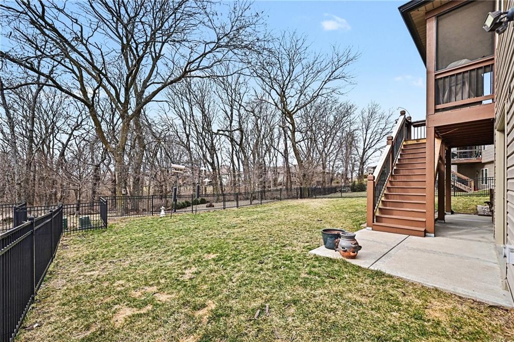 Located in the desirable Greyhawke neighborhood within Smithville School District, this home offers an ideal location just minutes from Smithville Lake, walking trails, a dog park, and a nearby golf course. Upon entering, you are welcomed by vaulted ceilings and beautiful wood floors that continue throughout the main living spaces, along with plantation shutters throughout the home. The open concept living room flows seamlessly into the kitchen and dining area and features large windows and a cozy gas fireplace. The kitchen offers a walk in pantry, stainless steel appliances, and warm wood finishes that complement the space. The primary bedroom includes vaulted ceilings, large windows, and private access to the screened in porch. The ensuite bathroom features dual sinks, a soaking tub, a separate shower, and a spacious walk in closet with direct access to the laundry room for added convenience. Two additional bedrooms and a full bathroom complete the main level along with a three car garage. The lower level provides a large basement ready to be finished and customized to your needs, along with a bedroom and full bathroom. A generous storage area offers plenty of space and includes double exterior doors for easy access. The backyard is fully fenced with black metal fencing and backs to a tree line, providing added privacy. Additional features include French drains and a gas line on the screened in porch, perfect for outdoor grilling and entertaining.