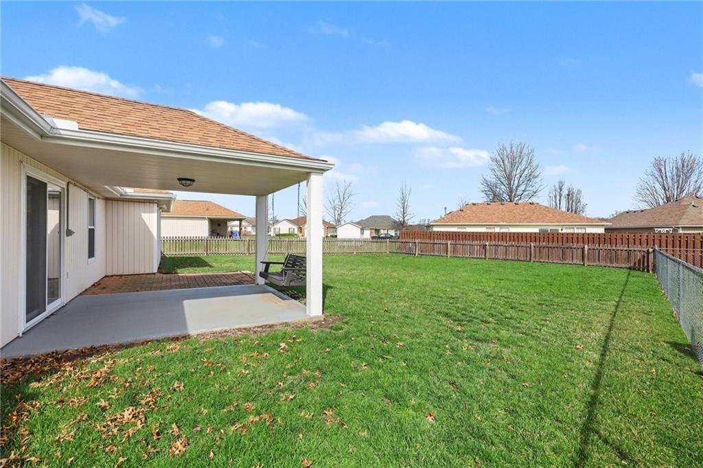 Beautiful ranch that shows like new! The inviting living room features vaulted ceilings and a cozy fireplace, creating the perfect space to relax or entertain. The kitchen offers granite countertops, tile backsplash, and a spacious walk-in pantry. The primary suite includes a tray ceiling, walk-in closet, and private bath with granite countertops. Newer windows and a newer back patio door provide added efficiency, and wood blinds are featured throughout the home. Step outside to enjoy the covered patio and fenced backyard — ideal for gatherings or quiet evenings at home. You’ll love the extra storage with an 8x20 space above the garage complete with lighting. Bonus: An 8-person storm shelter in the garage offers added peace of mind to keep your family safe.