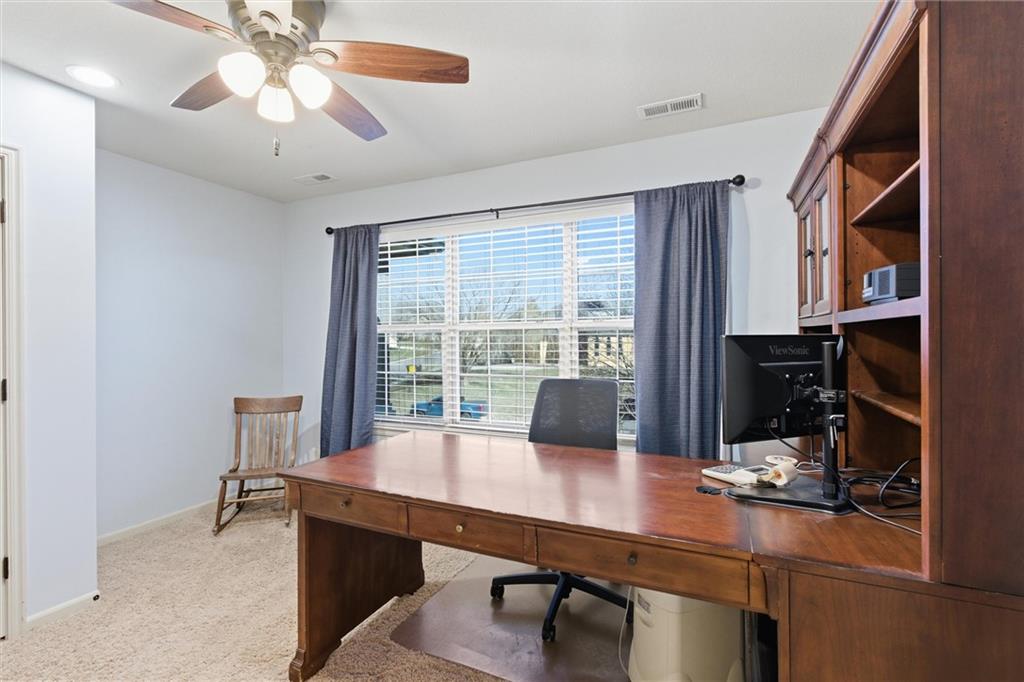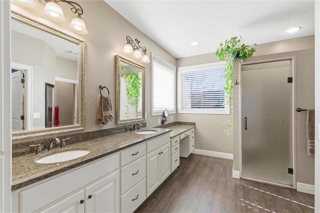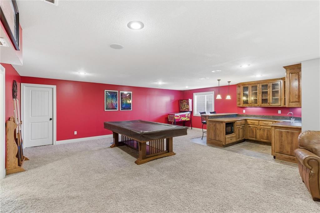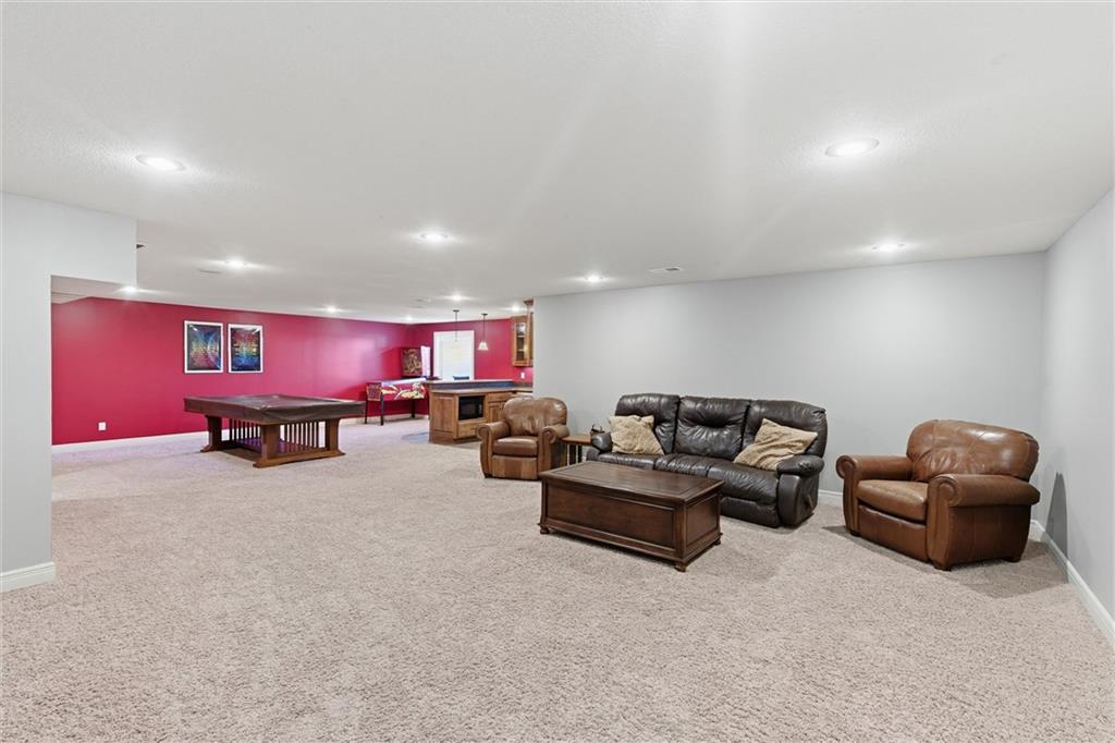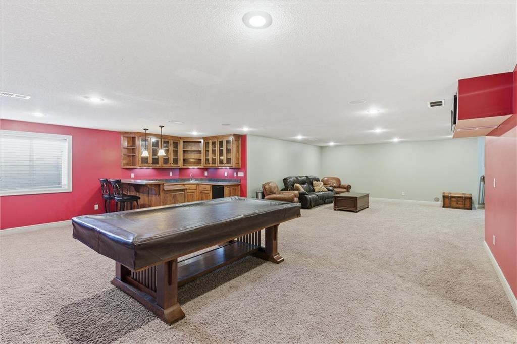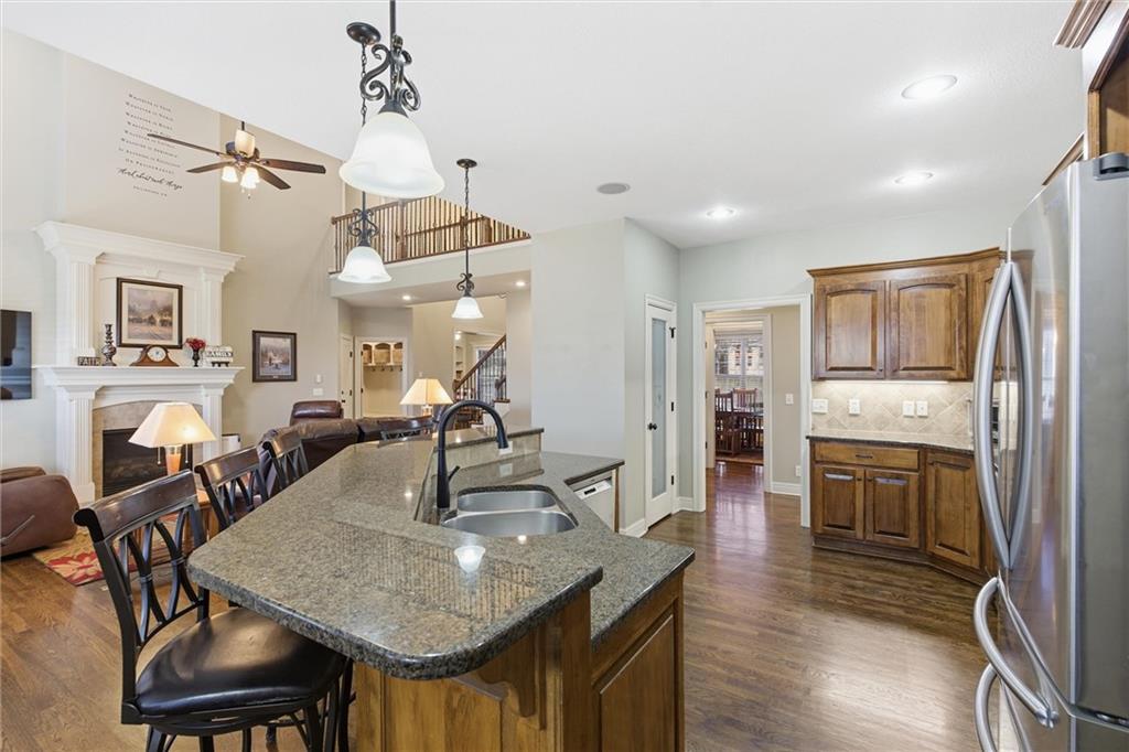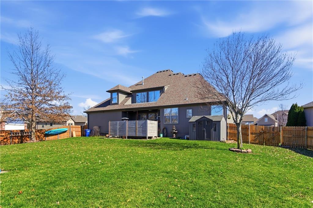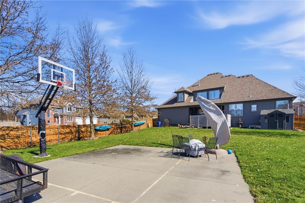 Welcome to this beautifully maintained 1.5-story home offering space, function, and timeless style on a large estate corner lot in Lee’s Summit. With a rare layout featuring both a spacious primary suite and secondary bedroom on the main level, this home is designed for flexibility and everyday comfort. Step inside to soaring ceilings, rich hardwood floors, and an inviting great room filled with natural light. The main level also includes a private office/den with custom built-ins, a formal dining room for gatherings, a mud room with built-in boot bench, and a laundry room complete with cabinetry and utility sink. The kitchen offers abundant cabinetry, granite countertops, stainless steel appliances, and a large island that opens seamlessly to the living area. Upstairs, you’ll find a versatile loft with built-in desks and cabinets, three generously sized bedrooms, and a full bath—perfect for family or guests. The finished lower level expands your living space with a large family room, full bar, bedroom, full bath, and a non-conforming room currently used as a gym. There’s still ample unfinished storage with built-in shelving. Enjoy outdoor living with a covered deck, patio, partial basketball court, privacy fence, and expansive yard, ideal for entertaining or relaxing. A truly well-cared-for home offering room to live, work, and play.