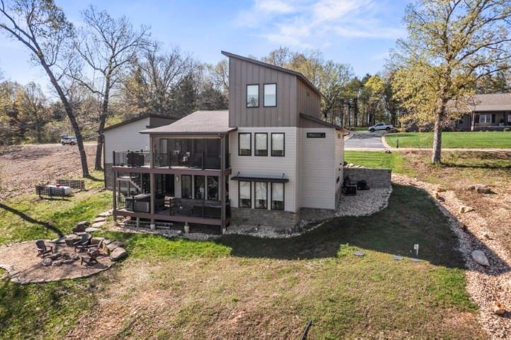 Enjoy modern lake living in this stylish contemporary home with a beautiful lake view and thoughtfully designed spaces throughout. Inside, you’ll find warm wood floors, a dramatic vaulted living room with a sleek linear fireplace, and oversized windows that fill the home with natural light. Step outside to both covered and open decks featuring modern railings, patio furniture, and a hot tub that’s perfect for relaxing or entertaining. The open kitchen is a standout, centered around an impressive 10-foot island with seating for eight (stools included), black stainless steel appliances, custom cabinetry, quartz countertops, and a pantry with built-ins. The main-level primary suite offers high ceilings and a spacious bath with double sinks, LED mirrors, quartz countertops, and a large 4x7 walk-in shower. The generous closet includes built-ins and a convenient washer/dryer hookup. Downstairs, the walkout lower level features a comfortable family room with a gas fireplace and deck access, a second bedroom suite with soaking tub and walk-in shower, a laundry room, ample storage, and a wet-bar hookup already stubbed in. Upstairs, guests will appreciate a private suite with a loft area, creating flexible space for additional sleeping, office use, or a retreat. The oversized two-car garage offers potential for a workshop or additional garage space with road access. A boat ramp is located just one mile away on Hwy H, and a possible third-party boat slip may be available through the dock master. This is a great opportunity to enjoy comfort, style, and lake-area convenience in one beautifully designed home.