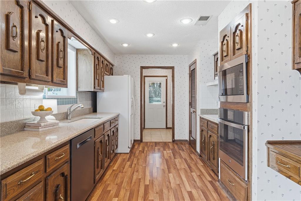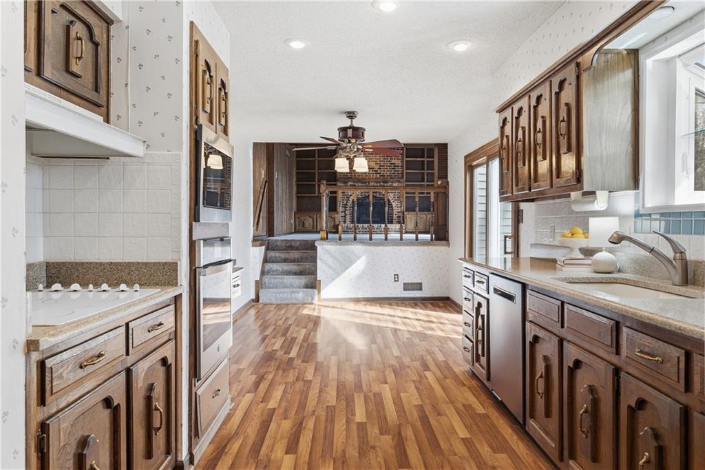 Tucked among mature trees in the desirable Hills of Walden in the Northland, this spacious 4-bedroom home offers privacy, flexible living space, and fantastic indoor-outdoor living. The lush, fenced backyard feels like a retreat with multiple decks and patios—perfect for relaxing, entertaining, or enjoying the peaceful wooded setting. Inside, the eat-in kitchen features solid surface countertops, plus newer stainless appliances including an oven, microwave, and dishwasher. A formal dining room provides the ideal setting for gatherings, while the inviting living room includes a cozy fireplace, built-in bookshelves, and a wet bar—great for entertaining. Just off the entry, a versatile flex room makes a perfect sitting room, home office, music room, or reading space. Upstairs, the spacious primary suite includes its own private martini deck and an updated ensuite bath. Three additional bedrooms share a large hall bathroom, offering comfortable space for family or guests. The walk-out basement expands the living area with a large great room and plenty of storage. Major updates include a new roof and HVAC system, providing peace of mind for years to come. With a private wooded setting, multiple outdoor living areas, and flexible interior spaces, this Hills of Walden home combines comfort, charm, and functionality in a sought-after Northland location.