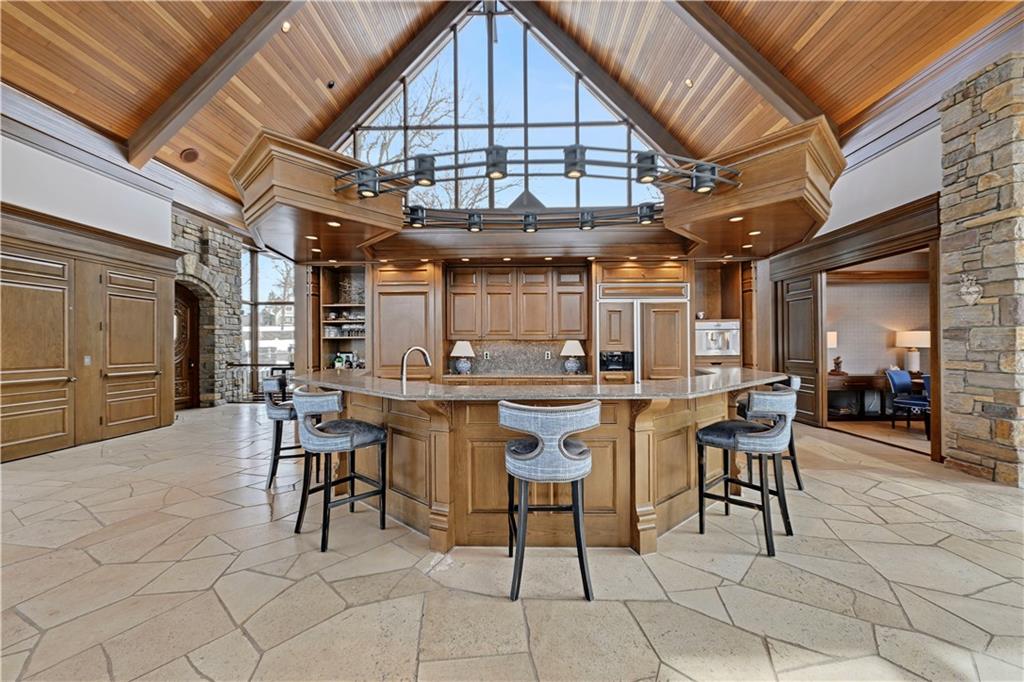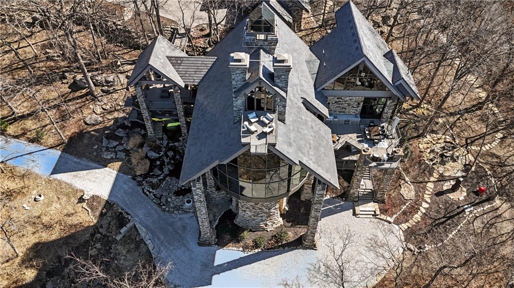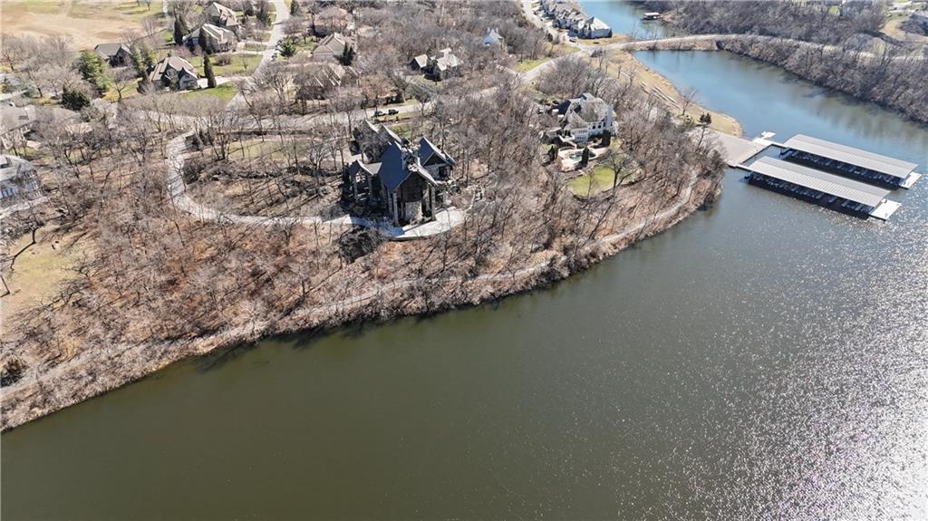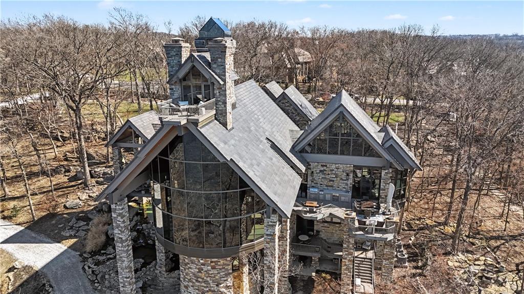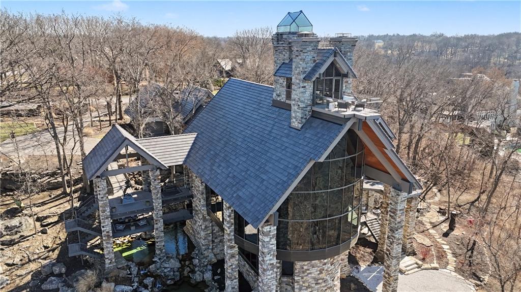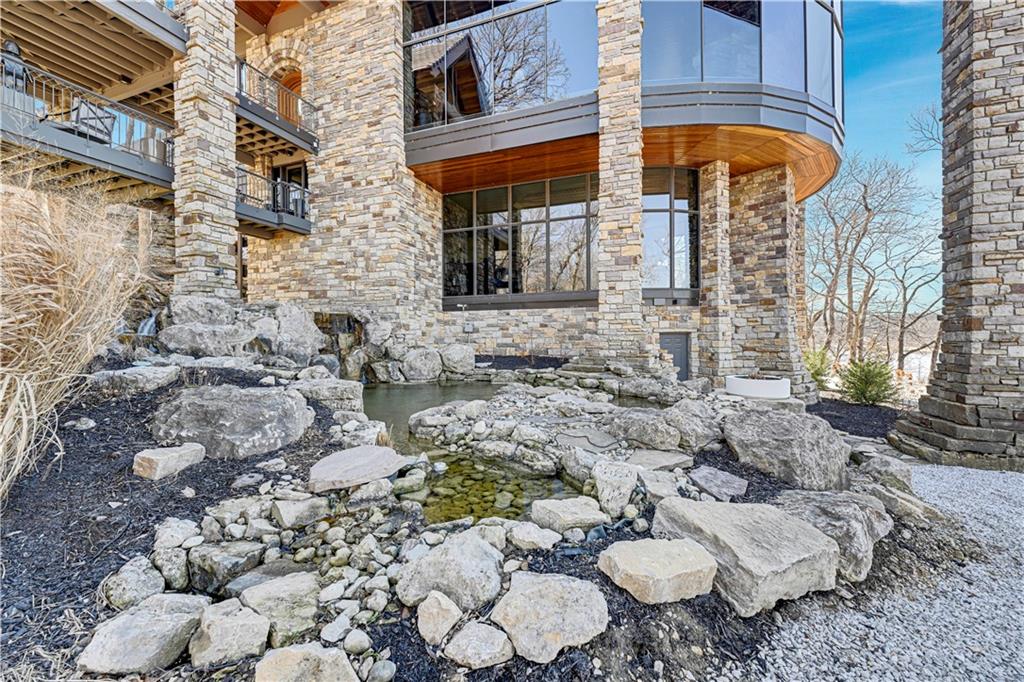 An architectural masterpiece rising from the shoreline, this iconic Loch Lloyd estate expertly fuses glass and stone to create the stunning effect of living within the landscape itself. The great room is a true "wow", anchored by a monumental, two-story stone fireplace and a soaring wood-plank cathedral ceiling. Tucked behind this massive hearth is a secret: a spiral staircase that climbs through the stone to a glass-walled lookout tower, and up even further to a deck atop the home, offering the most exclusive lake views in the community. Every level is designed to invite the outside in with walls of glass on all sides.The kitchen, featuring a secondary butler’s kitchen and seamlessly open to the great room, serves as the central hub for entertaining on the main level. The primary suite includes heated floors and a private loft. The primary bath is a serene spa-like setting with heated floors, dual vanities, a soaring vaulted ceiling, and separate tub and shower. The walk-out lower level is built for grand-scale hosting, centered around a massive family room with a fireplace, full bar and a full second kitchen. A passenger elevator offers ease of movement for people and entertaining equipment. This level also includes four additional bedrooms, two baths, and a second laundry room with dog wash station. Step down to a second lower level which features a large media/rec room plus a massage room for ultimate wellness. The grounds are a sensory and entertaining masterpiece with five tiered decks, an outdoor kitchen, firepit, cascading waterfall spilling into a koi ponds and custom outdoor art works scattered throughout the incredibly landscaped and wooded 2.5 acres. Despite the wow factor of the home, practicality abounds with features including a whole-house generator, new tile roof, and a 4-car garage. A rare fusion of nature and sophisticated design, every season is a new delight in this landmark home!