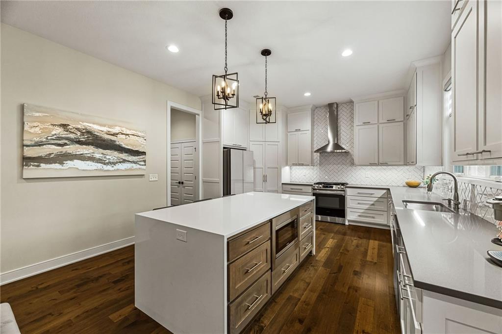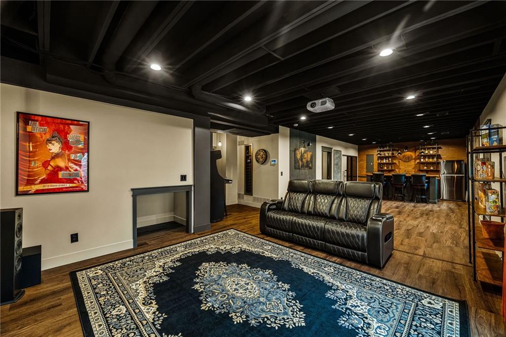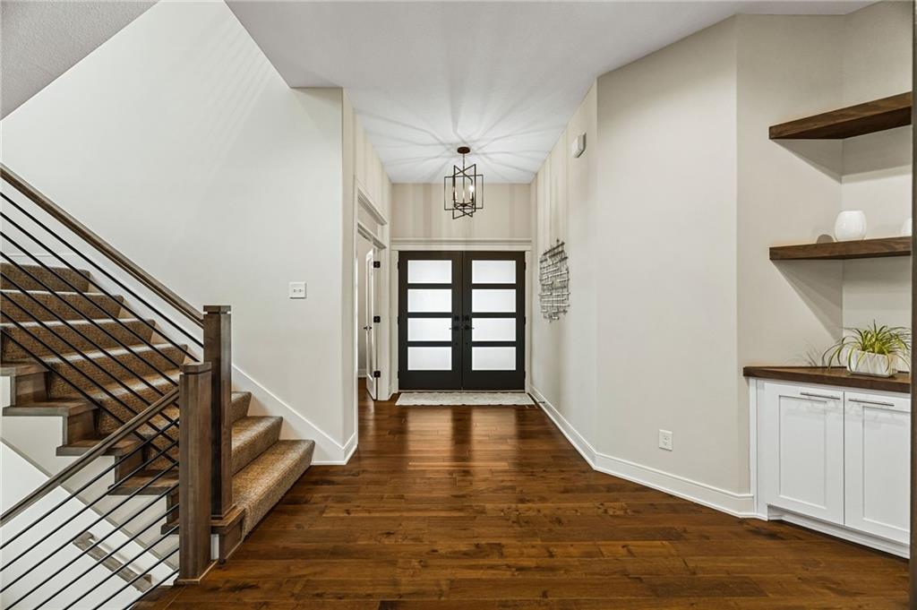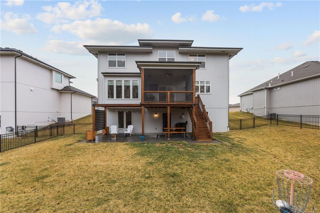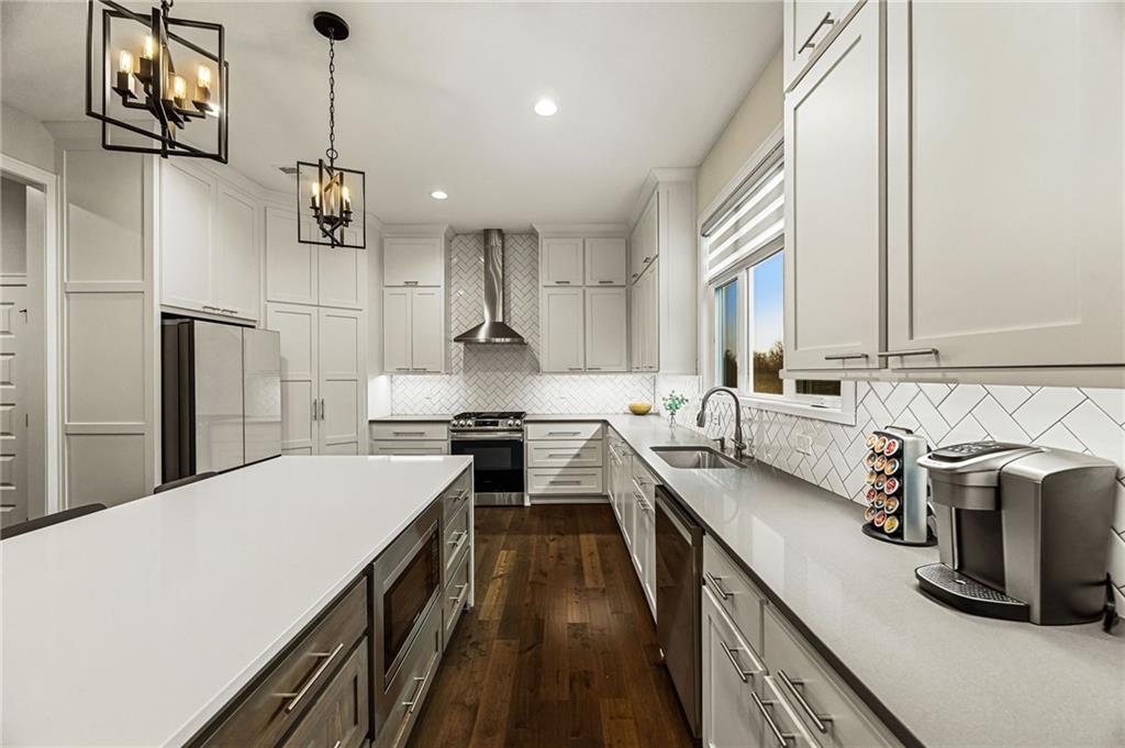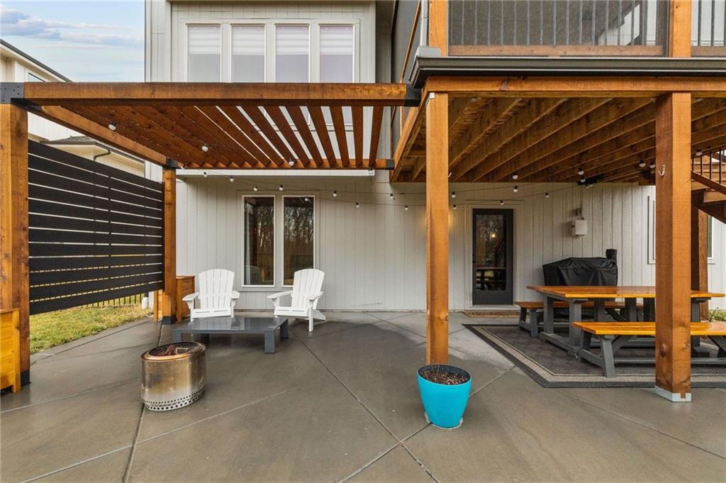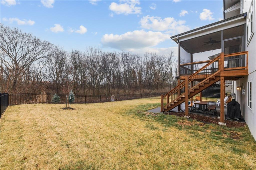 Some homes simply check the boxes. Others create a feeling the moment you arrive. Welcome to 9310 Carbondale Street in Lenexa, an award-winning Makenna two-story by Gabriel Homes on a premium treed walkout lot backing to peaceful green space. Built new for the current owners and thoughtfully enhanced since, it blends modern luxury with everyday comfort. Inside, 10-foot ceilings, hardwood floors, and expansive windows fill the home with natural light. The kitchen impresses with a quartz waterfall island, ceiling-height cabinetry, dramatic herringbone backsplash, and designer hood vent—beautifully blending style and function. The open layout flows into the great room, anchored by a floor-to-ceiling tiled fireplace. Upstairs, the spacious primary suite offers a spa-like bath and generous walk-in closet, while the secondary bedrooms provide comfort, space, and flexibility. The walkout lower level is unforgettable—moody, speakeasy-inspired, with a custom brick bar, cozy fireplace lounge, and dedicated theater area for movie nights, big games, and evenings with friends. Step outside to enjoy one of the home’s most inviting outdoor features. The screened-in deck and cedar pergola overlook tranquil green space, with sunset views stretching across the horizon. Highlights include bronze exterior windows, double front doors, upgraded 8-foot garage doors, steel fencing, underground downspouts, smart irrigation, under-cabinet lighting, and Lutron Caseta lighting in the finished basement. Nearly new and beautifully upgraded, this home offers the rare opportunity to enjoy new-construction quality with enhancements already complete—designed for gathering and savoring the moments that matter most.
