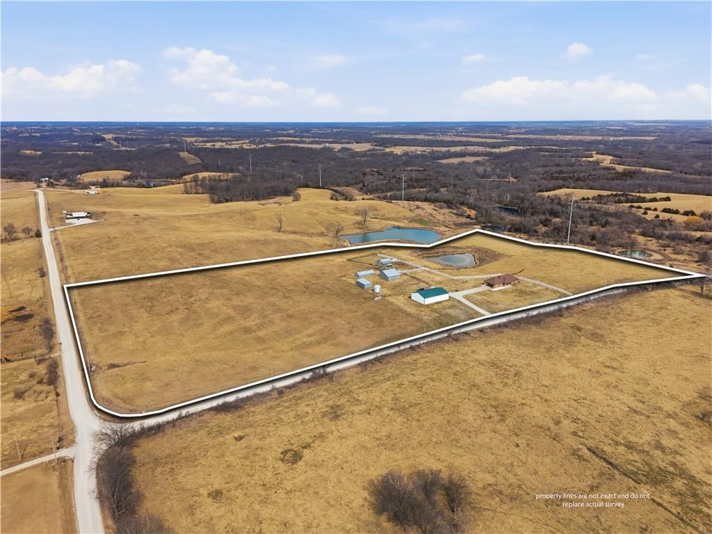 Beautifully maintained ranch home on 19+/- rolling acres featuring 2 main level bedrooms plus 3 non-conforming bedrooms in a fully finished walkout basement complete with a large second kitchen and spacious living room. Meticulously prepped for your comfort and located just 25 minutes from Kansas City, this property delivers the perfect mix of comfort, function, and wide open space. As you drive up, scenic views unfold across your land, buildings, fencing, and stocked pond. The large covered front porch is made for conversations that turn into lasting memories. The main level offers an open concept layout filled with natural light. The kitchen has northern exposure to the property, while the living room features large south-facing windows. Two oversized bedrooms sit on the main floor, including a spacious primary suite with private bath and pond views. A full hallway bath adds convenience. The kitchen includes granite countertops and space for a full size dining table. The walkout basement expands the living space with three additional non-conforming bedrooms and direct outdoor access, ideal for multi-generational living, guests, or entertaining. Formerly a cattle farm, the property is well suited for horses and includes recently painted fencing and gates, refreshed barns, and five total outbuildings. The 40x60 shop with concrete floors and power offers serious workspace. Fencing supports multiple farm animals, including that sought after Highland cow. An additional acreage directly north is available to expand your farm life even more. In the spring, the land comes alive with lush grass and vibrant views. Peaceful country living with city access within minutes. Well cared for. Move in ready. Built for lifestyle and legacy.
